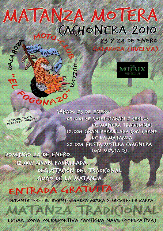 La Matanza Motera Cachonera se ha convertido ya en un clásico de nuestro calendario. A la del año pasado asistieron incluso las cámaras de Canal Sur Televisión, que dio cuenta de la fama que está alcanzando esta fiesta mitad cultural y mitad motera. La próxima edición llegará el día 23 de Enero de 2010, con las habituales actividades de sacrificio de dos cerdos ibéricos según la manera que nos enseñaron nuestros mayores y que pertenece a nuestra cultura popular, degustación de productos ibéricos y convivencia motera, que se suman a otras nuevas que hemos ideado para aumentar la calidad de la fiesta.