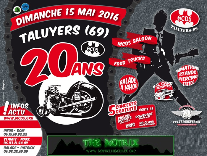 Programme : POUR LA 12 EME ANNEE CONSECUTIVE LE CLUB MOTO D5 ORGANISE LA CONCENTRATION MOTO DE TALUYERS AVEC CONCERTS STANDS STRIP SNACK JEUX ENFANTS,ENTREE GRATUITE,VENEZ NOMBREUX BYE TOM