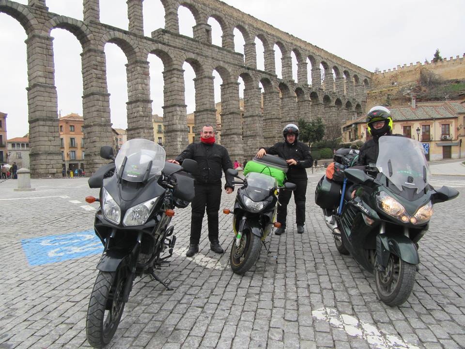 En la primera reunión de este año en la que coincidimos varios componentes del motoclub, se barajó la posibilidad de asistir a la reunión invernal de Riberas de Voltoya. Al final se concretó y este pasado viernes día 16 Javi y Antonio me pasaron a recoger a la altura de Lleida a las 16,30 para seguir ruta por la N II dirección Zaragoza. Con el cielo ligeramente cubierto, lo que permitió que la temperatura oscilara entre los 7ºC y los 8ºC todo el camino,seguimos circulando por la N 232 dirección Logroño hasta enlazar con la N 122 dirección Soria, en Tarazona tuvimos una buena vista del Moncayo completamente nevado. Antonio había reservado hotel a unos 6 kms. de Soria, donde llegamos cuando empezaba a anochecer. La reserva constaba de media pensión y , sorprendentemente, de garaje privado para las tres motos. Antes de cenar cayó la primera cervecita y después, otras más. Por la mañana, después de un buen desayuno, continuamos la ruta con el cielo cubierto y una temperatura de 4-5ºC; en San Esteban de Gormaz tomamos la N 110 dirección Segovia, donde llegamos sobre las 11 de la mañana y paramos a hacernos la clásica foto con el acueducto de fondo y tomamos un café. Después por la CL 605 dirección Arévalo hasta llegar al cruce de Juarros de Voltoya, lugar de la reunión. Después de acampar en el recinto de las piscinas e inscribirnos, (30 €: bolsa con camiseta, pin, pin conmemorativo del 25 aniversario, programa del evento y un par de regalitos publicitarios) pasamos de comer allí para darnos un pequeño festín en Arévalo, comiendo el famoso cochinillo después de un buen surtido de ibéricos y regado todo con un buen ribera del Duero. Los postres, perfectos y tras un café , la dirección del restaurante nos obsequió con un chupito de café aderezado con nata que estaba de muerte. Al regresar al evento, empezó la rutina habitual, saludos y más saludos; muchos conocidos: Agustín, Alex, Jesús, Josep y Emili, todos venidos de tierras catalanas y, por supuesto , la gente del El Foro, organizadora del evento, Paapa, Juan, Merche, José, Encarna, Pirata y otros tantos miembros de Carretera y Manta, además de Higinio y Jesús y también Txumari. En fin, un ambiente de lo mejor. A las cinco repartieron el caldo y a las seis prendieron la hoguera para dar la cena más tarde en la carpa. Unas altas mesas sin sillas para tomarla de pie: empanada de carne y otra de atún, guisado de carne, vino, pan, agua y naranja o manzana. Después disco móvil hasta las tres de la mañana y entremedio, entrega de premios y sorteo. Motrix se llevó el premio al motoclub más lejano. La noche, al quedarse el cielo muy raso, fue fría, a las ocho de la mañana el termómetro de la moto marcaba -6ºC, pero como hacía sol, la escarcha se fundió rápidamente y, tras tomar el desayuno: zumo, ensaimada y café con leche, nos dispusimos a recoger tranquilamente para desandar el camino, saliendo de Juarros a las 12,15. Paramos a comer en San Esteban de Gormaz y desde allí a Almazan Y Monreal de Ariza para enlazar con la A2 y seguir rumbo Zaragoza y la N II hacia Lleida y Cerdanyola y Sant Vicenç del Horts. En fin, un buen fin de semana, buena compañia, muchas caras conocidas y, sobretodo, mucho ánimo al motoclub El Foro, ¡ continuad ! ánimo Luís.