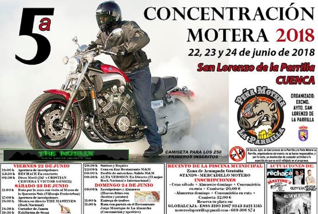 En concierto en Los Jardinillos: LA MOES ROCK BAND el viernes 24 y ALTA VERSIÓN el sábado 25. Ruta para los asistentes el sábado por la mañana, PAREJA MIXTA LAVA MOTOS en la piscina municipal y exhibición de CALVETE STUNT el sábado por la tarde y por la noche desfile de antorchas. El domingo almuerzo (Huevos con chorizo y una sorpresa para este año), seguidamente la ruta con parada en MOOVIE CUSTOM BAR de Valverde de Júcar y BAR M&M de La Parrilla (Incluida una consumición en cada establecimiento con la inscripción) y comida en el polideportivo municipal para terminar la concentración con la entrega de premios y sorteo de regalos.