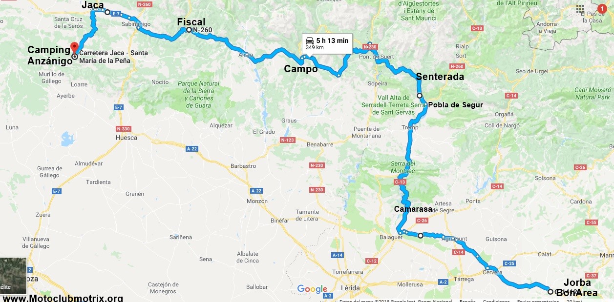 Segunda concentración a la que más socios de Motrix han asistido. Aunque, en principio mi intención era ir directamente el sábado a media mañana a Anzánigo, el viernes a última hora decidí unirme al resto del grupo y el sábado me presenté en Jorba para almorzar juntos. A las 9,30 fueron llegando, primero Forni y después Kake, Pedro, Javier y los simpatizantes y amigos Ester y Jordi "Boquerón". A eso de las 11 ya habíamos acabado y emprendimos la ruta que nos llevó, a través de la A2 pasando por Cervera, Agramunt, La Sentiu, Camarasa, Tremp, La Pobla de Segur, Senterada, Pont de Suert, El Turbón, Campo, Ainsa, Boltaña, Fiscal, Sabiñánigo, Jaca y finalmente, Anzánigo. El camping como casi siempre para este evento estaba lleno; después de instalarnos hicimos un pequeño piscolabis y junto a Cristian y Carme que llegaban entonces nos dispusimos a compartir la velada. Tengo que decir que la ruta nos permitió pasar por algunos bonitos puertos de montaña : La Panadella, Fontllonga, Perves, Viu de Llevata, Bonansa, Foradada y Oroel.