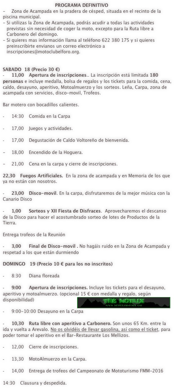 (Para mas información... Damián 622 380 175 / Victor 679 973 710 / info@motoclubelforo.org)