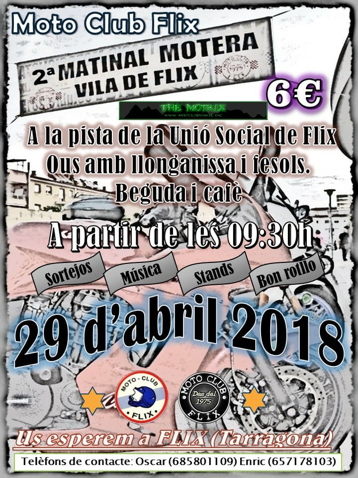 Després de l’èxit que va tenir la 1ª Matinal Motera “Vila de Flix” 2017, tornem amb la 2ª Matinal Motera “Vila de Flix”