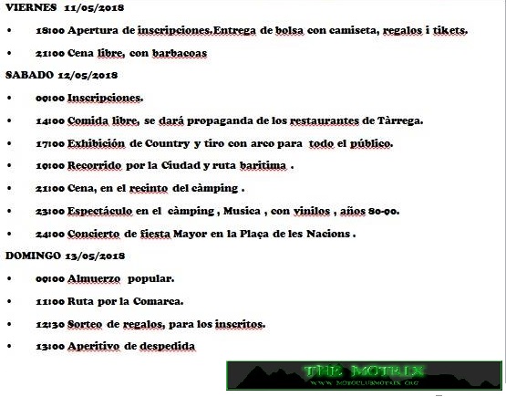 Concentración motera abierta para todo tipo de motos, desde el viernes tarde en el camping municipal,servicio de duchas, barbacoas, bar(precios de motero) ambiente familiar, juegos, mercado de paradistas moteros,sábado cena y domingo almuerzo gratuito hasta 700 (bocadillo )