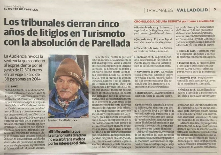 La Audiencia Provincial acaba de cerrar cinco años de litigios entre los actuales directivos del motoclub Turismoto y los anteriores, encabezados por su expresidente, Mariano Parellada, con la anulación de la sentencia que condenó a este último y a otros tres exsocios por un gasto realizado en 2014, cuando la entidad abonó 12.301 euros para sufragar un viaje de 38 personas a una concentración motera en Faro (Portugal). Los cuatro han sido absueltos ahora por el tribunal al entender los magistrados que aquel viaje se enmarcó en la «manera habitual del club de subvencionar actividades destinadas a la promoción de Pingüinos» en el extranjero, según recoge el fallo notificado el pasado viernes.