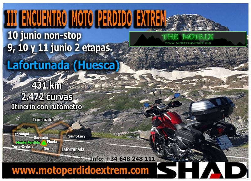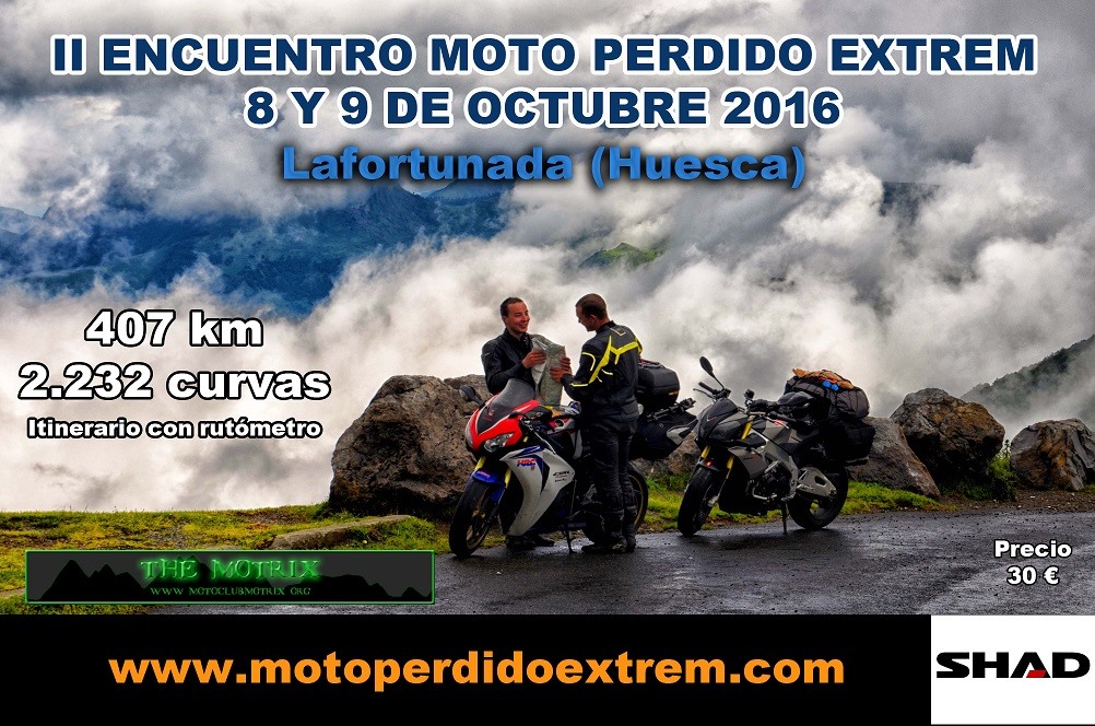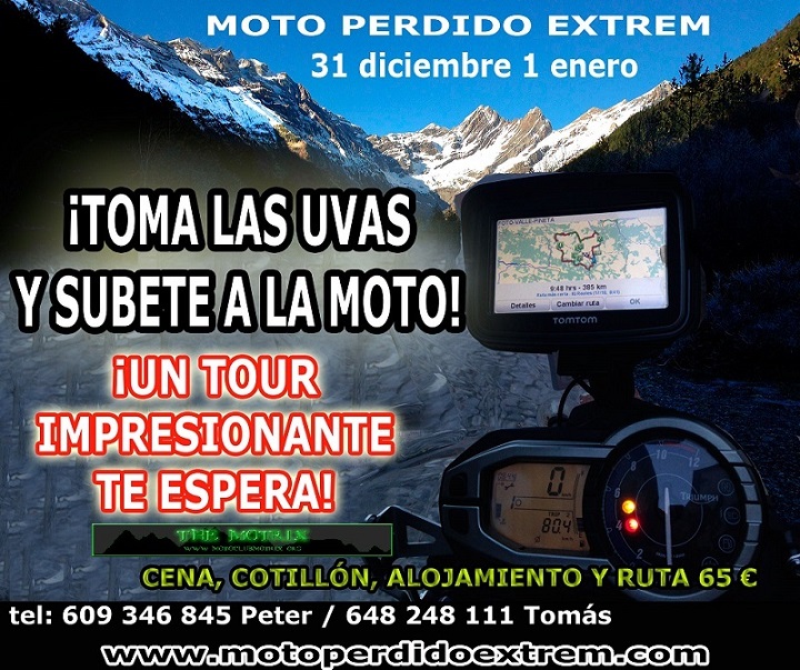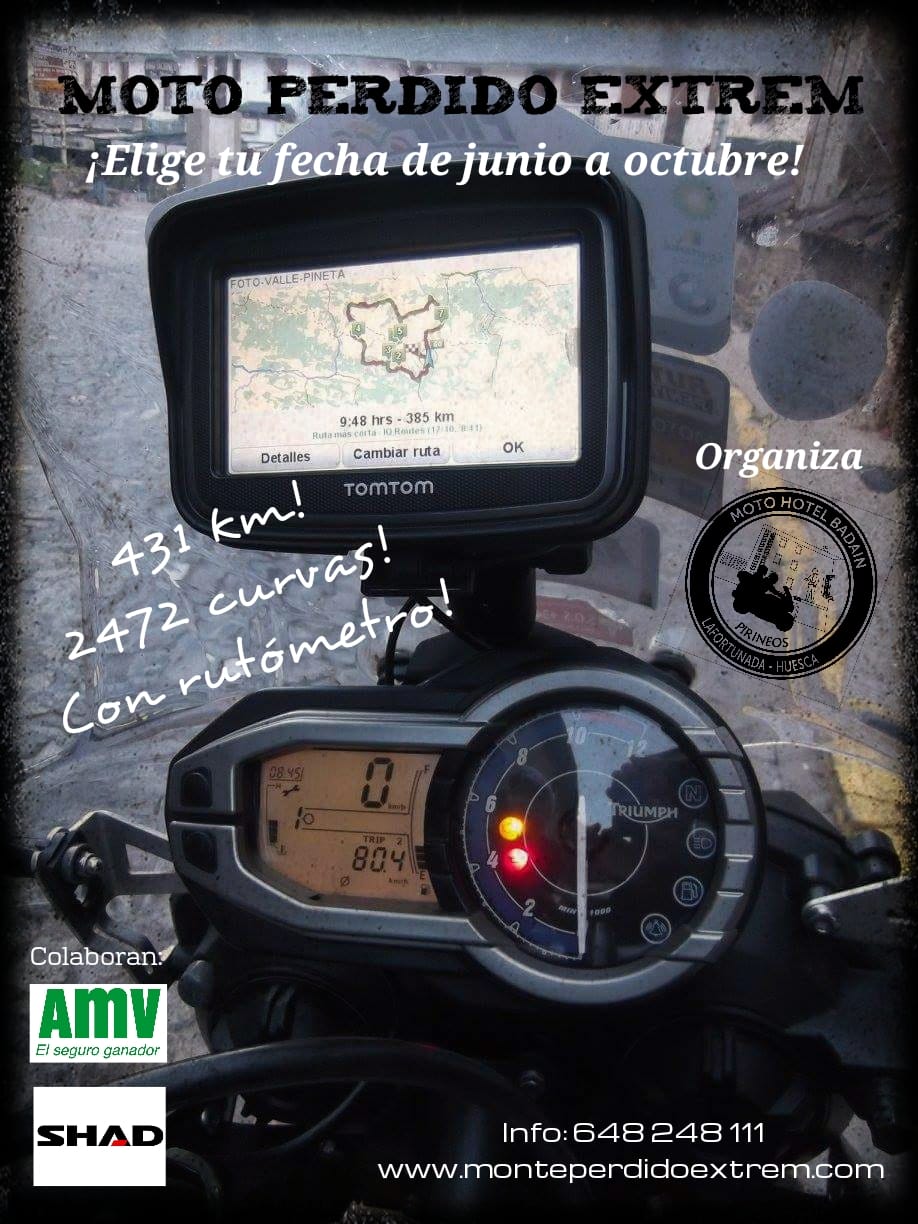 ¡¡Si os gusta disfrutar de la esencia del propio viaje; esas sensaciones que sólo los moteros podemos apreciar, entonces el Tour Moto Perdido Extrem está hecho para vosotros!! 431 km y 2.472 curvas de magníficos parajes considerados gran parte de ellos Patrimonio de la Humanidad por la Unesco os esperan ¡Los más bellos parajes de los Pirineos! ¡Y no lo decimos nosotros, lo dicen quienes la han realizado! Podéis ver las opiniones en nuestro Facebook