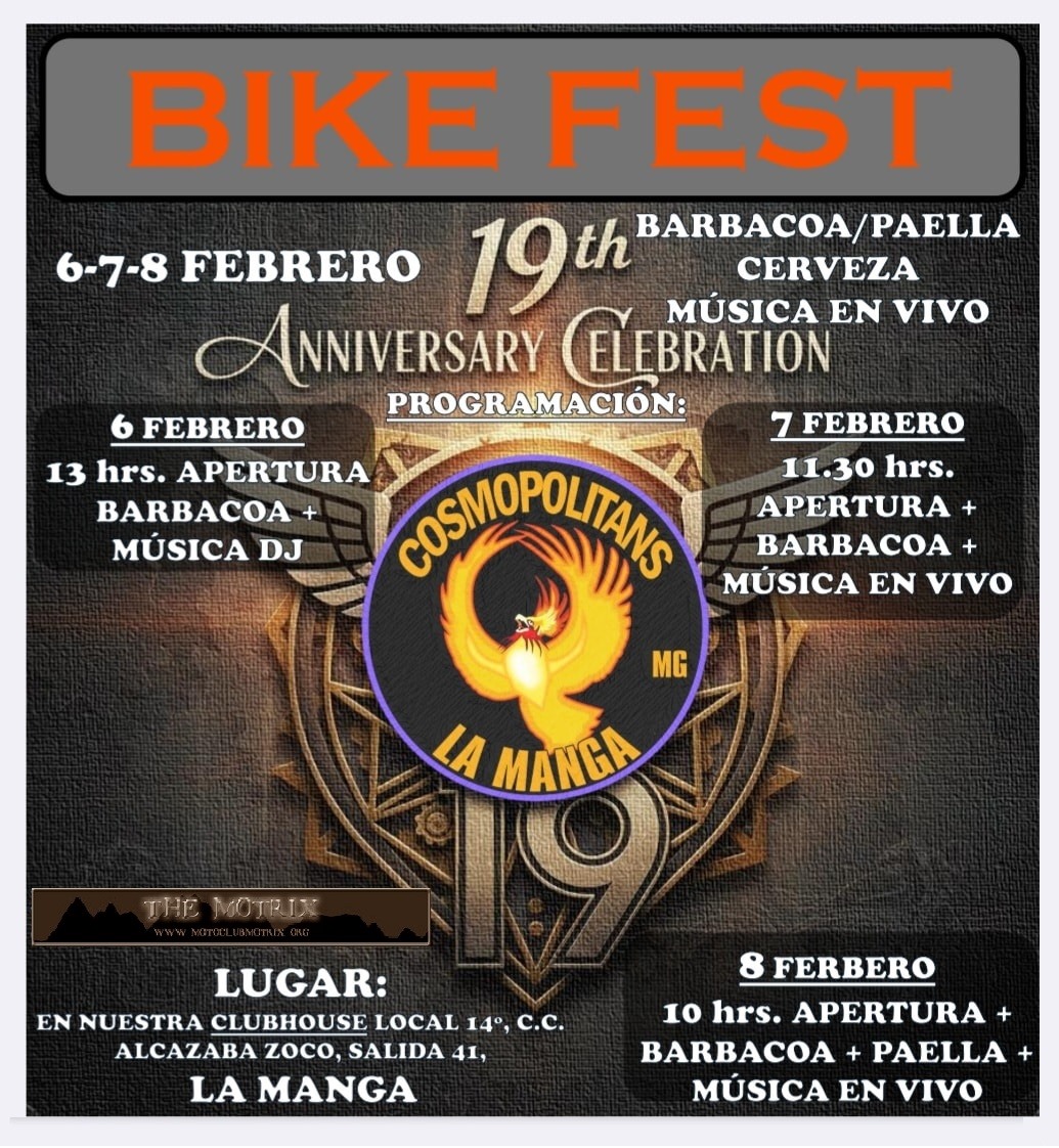 PRESENTACION OFICIAL DEL ALMUERZO MOTERO MÁS LARGO DE ESPAÑA!!! TODOS BIENVENIDOS, VII ANIVERSARIO COSMOPOLITANS, EMPEZAMOS EL 9 DE ENERO Y CERRAMOS EL EVENTO EL DOMINGO 11 DE ENERO... EN EL CORAZON DE LA MANGA "PLAZA BOHEMIA" KM 3, CARPA GIGANTE, GRAN BARRA, PRECIOS POPULARES, BARBACOA NACIONAL Y DE BRATWURST CON CURRY SAUCE, PUESTOS DE VENTA, ROPA, BISUTERIA MOTERA... DOMINGO CONCIERTO TENEMOS HOTELES A PRECIOS IMBATIBLES, CAMPING A 5 KM Y SI NO MILLAS DE PLAYA... NOS VEMOS, QUE NO DECAIGA EL ESPIRITU, BIKERS FOREVER!!