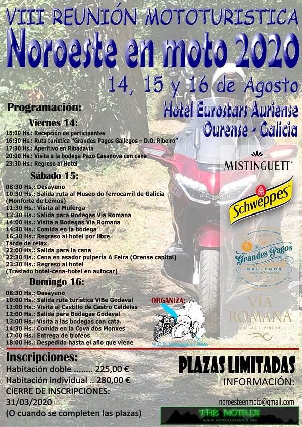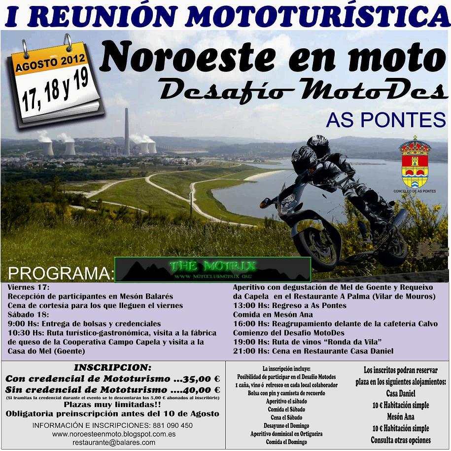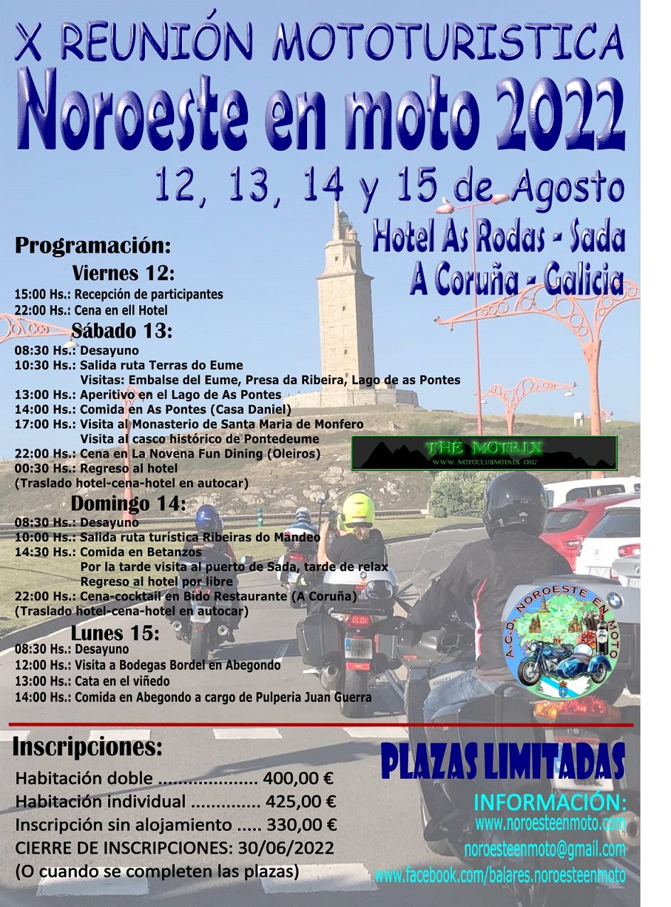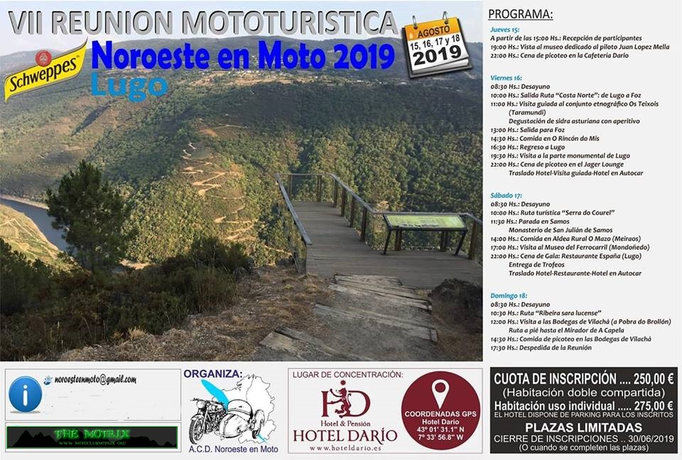 Noroeste en Moto pretende ser una concentración de las “de antes”, aquellas a las que la gente acudía para reunirse con gente con sus mismas aficiones y disfrutas de dos o tres días en compañía de otros moteros. Compartir risas, charlas, unas cervezas y una buena comida y, al final, intercambiar los teléfonos para quedar “la próxima vez que pases por mi pueblo”. Así gente como yo conoció a mucha gente con la que años después todavía te ríes comentando anécdotas y recordando otros tiempos. Noroeste en Moto quiere ser eso, no tendremos stunts, ni derrapadas, ni pruebas de aceleración, ni rayos láser pero si tendremos dos preciosas rutas en las que, con suerte, disfrutaremos de una buena rodada y de un buen aperitivo rematado con una comida servida con el máximo cariño y dedicación.