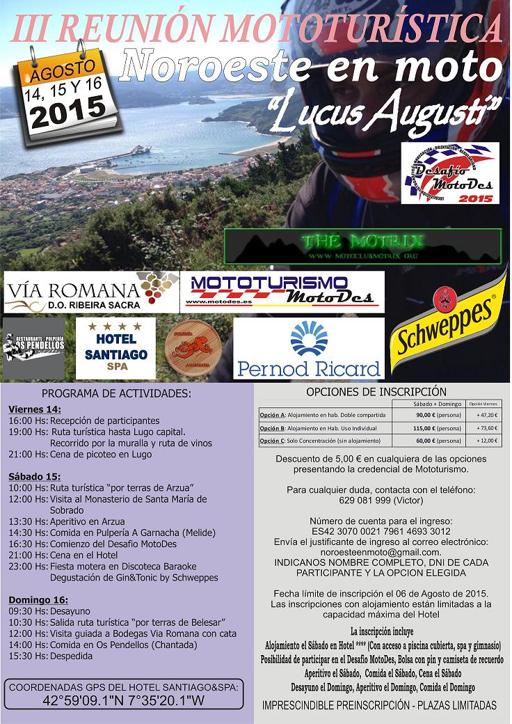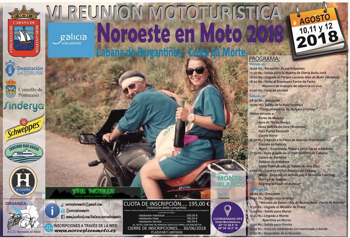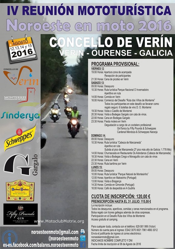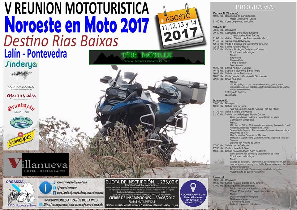 Noroeste en Moto pretende ser una concentración de las “de antes”, aquellas a las que la gente acudía para reunirse con gente con sus mismas aficiones y disfrutas de dos o tres días en compañía de otros moteros. Compartir risas, charlas, unas cervezas y una buena comida y, al final, intercambiar los teléfonos para quedar “la próxima vez que pases por mi pueblo”. Así gente como yo conoció a mucha gente con la que años después todavía te ríes comentando anécdotas y recordando otros tiempos. Noroeste en Moto quiere ser eso, no tendremos stunts, ni derrapadas, ni pruebas de aceleración, ni rayos láser pero si tendremos dos preciosas rutas en las que, con suerte, disfrutaremos de una buena rodada y de un buen aperitivo rematado con una comida servida con el máximo cariño y dedicación.