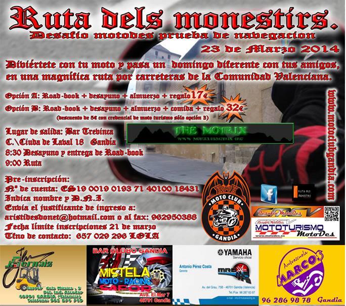 Este año el MOTOCLUB GANDIA ha organizado la RUTA DELS MONESTIRS para el próximo día 22 de marzo de 2015.