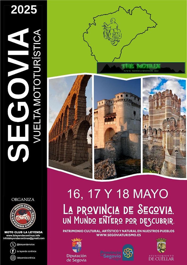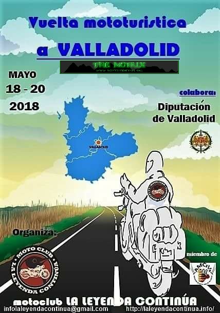 El Moto Club La Leyenda Continúa de Valladolid, organizador, entre otras actividades, de la Concentración Invernal de enero “La Leyenda Continúa” en Cantalejo (Segovia), vuelve a organizar para los días 18,19 y 20 de mayo la “VUELTA MOTOTURÍSTICA A VALLADOLID”, un completo fin de semana, desde la noche del viernes en la que tendrá lugar la recepción de los motoristas participantes en un hotel de la zona, hasta la comida de despedida del domingo, durante el que se recorrerán carreteras y rincones poco conocidos de la provincia, en plena meseta castellana, visitando lugares de interés y degustando los más típicos productos gastronómicos de la zona, en la inscripción se incluyen todos los gastos de dos noches de hotel, desayunos, comidas, cenas y aperitivos en ruta, programa y recuerdo de la Ruta.