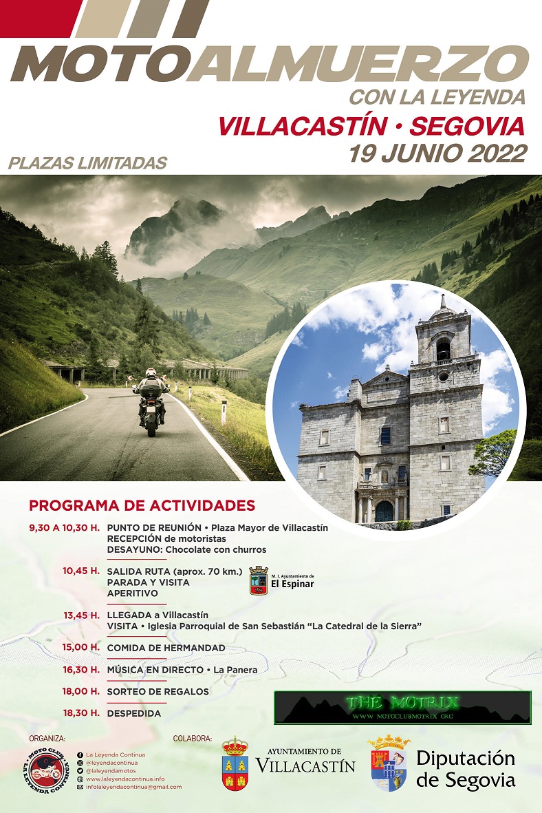 Tres años después del Encuentro de la "Luna Llena Motera" de Villacastín, el Club de Moto La Leyenda Continúa convoca en esta villa segoviana una reunión para sus fieles amigos. Una jornada de convivencia, con un programa muy atractivo. A primera hora de la mañana se disfrutará de un desayuno antes de salir a realizar una corta, pero muy interesante ruta por la zona, para regresar a Villacastín y realizar una visita antes de La comida de hermandad.
