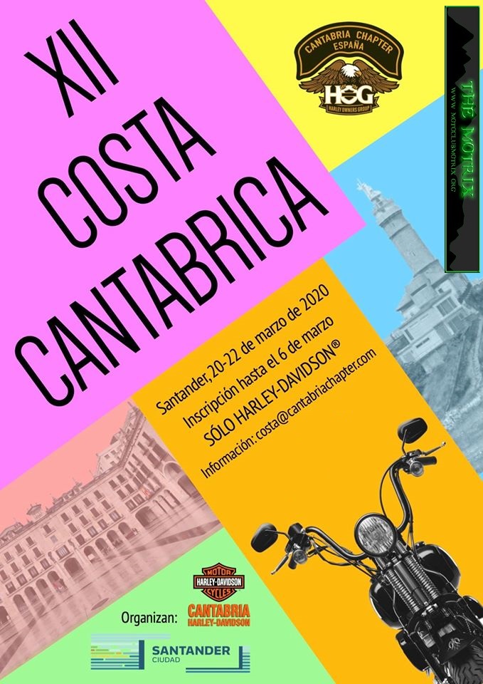 Evento anual del Cantabria HOG Chapter para propietarios de Harley-Davidson para disfrutar de un fin de semana entre amigos de la gastronomÍa, cultura, paisajes y rutas de Cantabria. En el hotel Olimpo con pensión completa, ruta moto-turística, conciertos de pop-Rock, música regional en directo y pack de preinscripción. Apertura de preinscripción a mediados de enero 2016 y cierre el 12 de febrero. Consultas y preinscripciones solo a traves del mail costa@cantabriachapter.com
