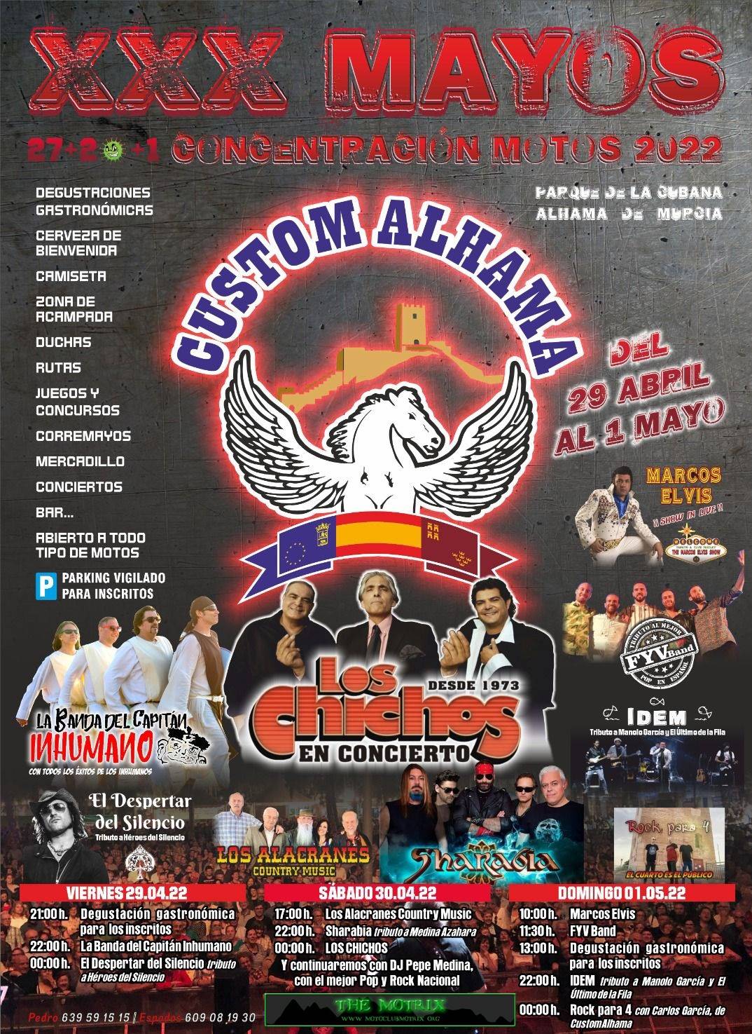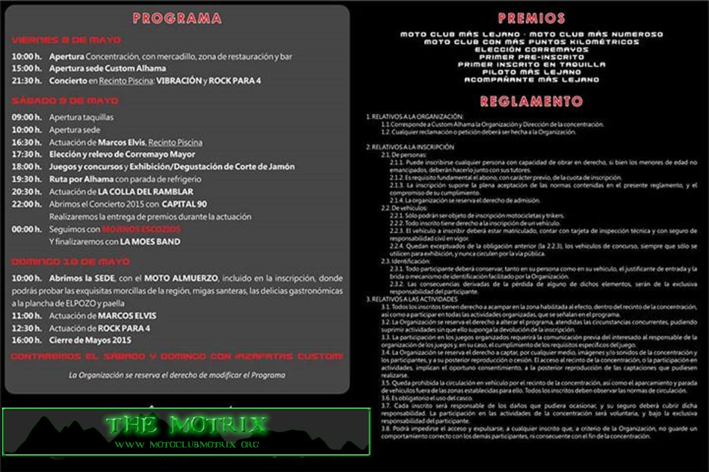 -.12:00h. Apertura, entrada gratuita, inscripción opcional, cerveza de bienvenida, camiseta , zona de acampada con duchas en Parque municipal La Cubana (Alhama de Murcia), parking vigilado para los inscritos, mercadillo, bar , concursos, juegos , rutas, degustación gastronómicas, corremayos, conciertos, entrega de trofeos .