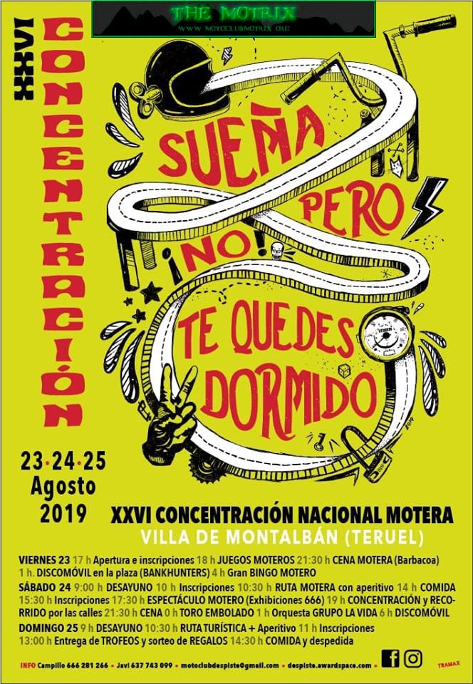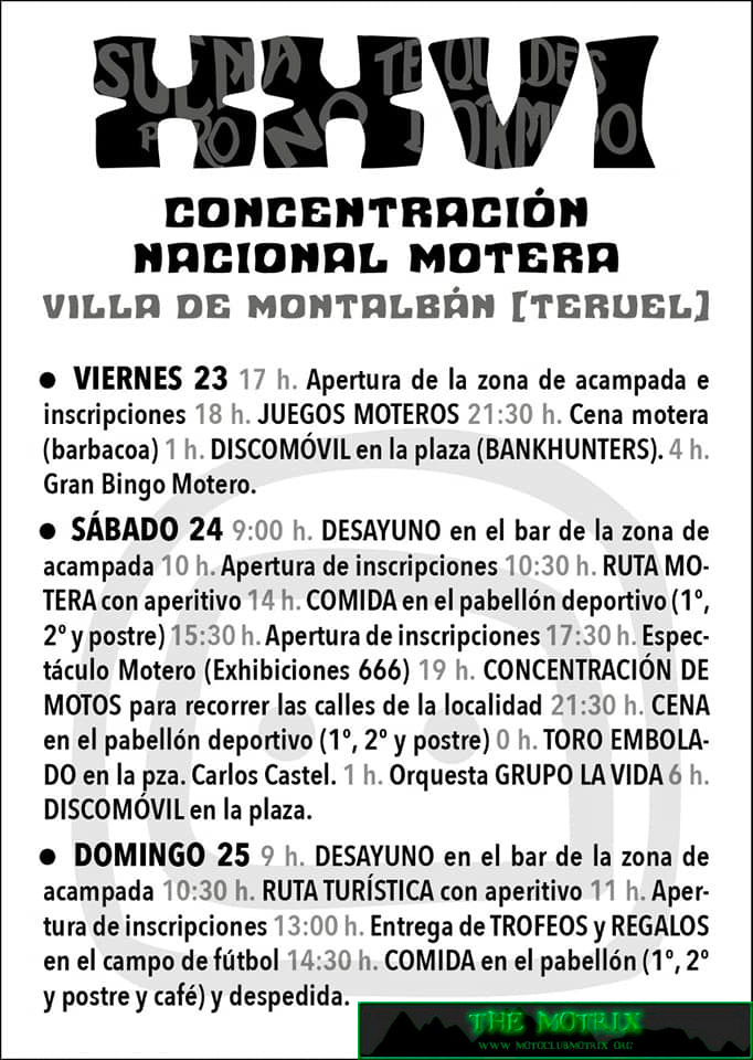 Como apunte. Hay que decir que el precio resulta -por comparación con otros eventos similares- algo excesivo (65€ preinscripción, 75€ en taquilla). Cabe analizar este único "pero", de la subida de precios, desde la sana crítica para que no sea una tendencia, puesto que no hay que olvidar que el mundo de las dos ruedas es ante todo hermandad y compartir entre compañeros de las dos ruedas. Para evitar caminar en la dirección que el precio sea determinante a la hora de decidir a qué eventos acudir. Si bien, el Motoclub Despiste y la gente de Montalbán son buenísima gente que se vuelca este fin de semana y hacen que su concentración una apuesta segura de pasar un fin de semana de motos genial, tras el aval de 28 ediciones.