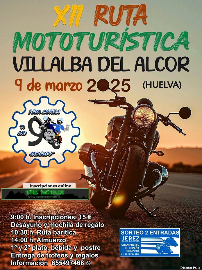 Por el presente comunicamos que, debido a las condiciones meteorológicas adversas 🌧 previstas para el próximo 9 de marzo, la XII RUTA MOTOTURÍSTICA VILLALBA DEL ALCOR, se aplazará para el domingo 6 de abril del presente año.