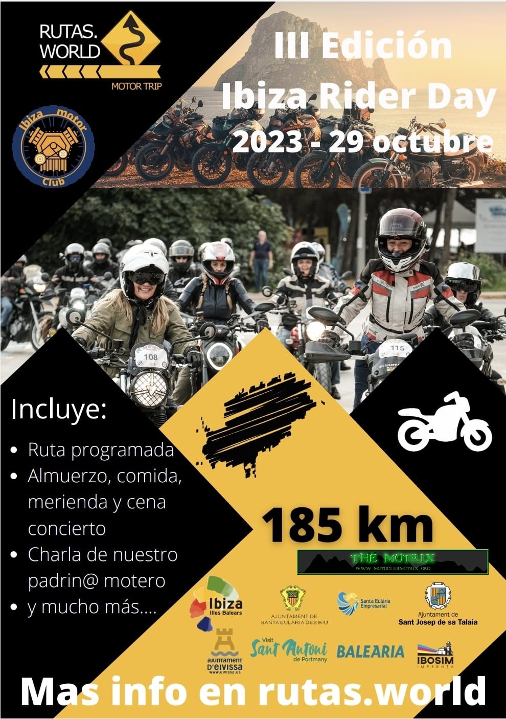 El IBIZA RIDER DAY es un evento motociclista no competitivo, mototurismo, de 185 km donde hay que certificar el paso por 5 puntos de control, con salida y llegada en el mismo punto, situado en Santa Eulalia del Río.