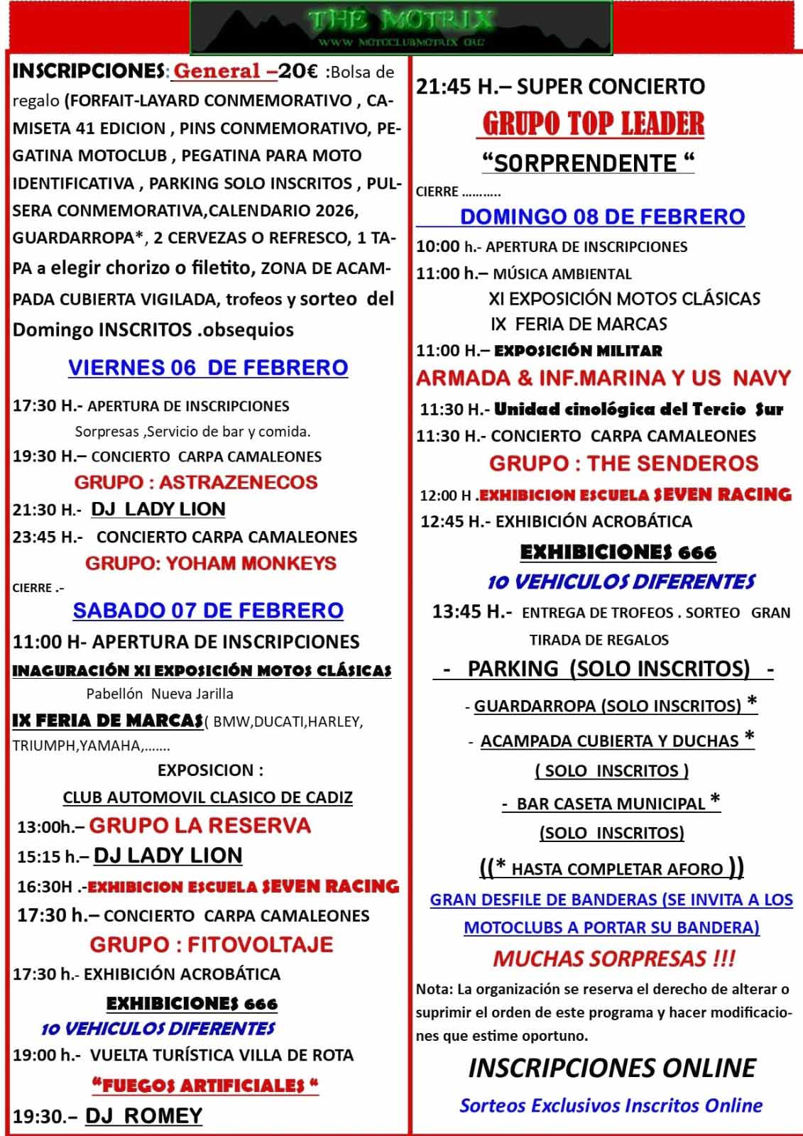 Bolsa regalo, cerveza o refresco de bienvenida, guardarropa, parking y acampada vigilada cubierta y con duchas, zona WI-FI gratis, bar con tapas y raciones, stands moteros, música ambiental, exhibición acrobática, vuelta turística Villa de rota, cena para inscritos, gran fiesta motera, striptease integral mixto, actuaciones musicales y grupos de rock .........