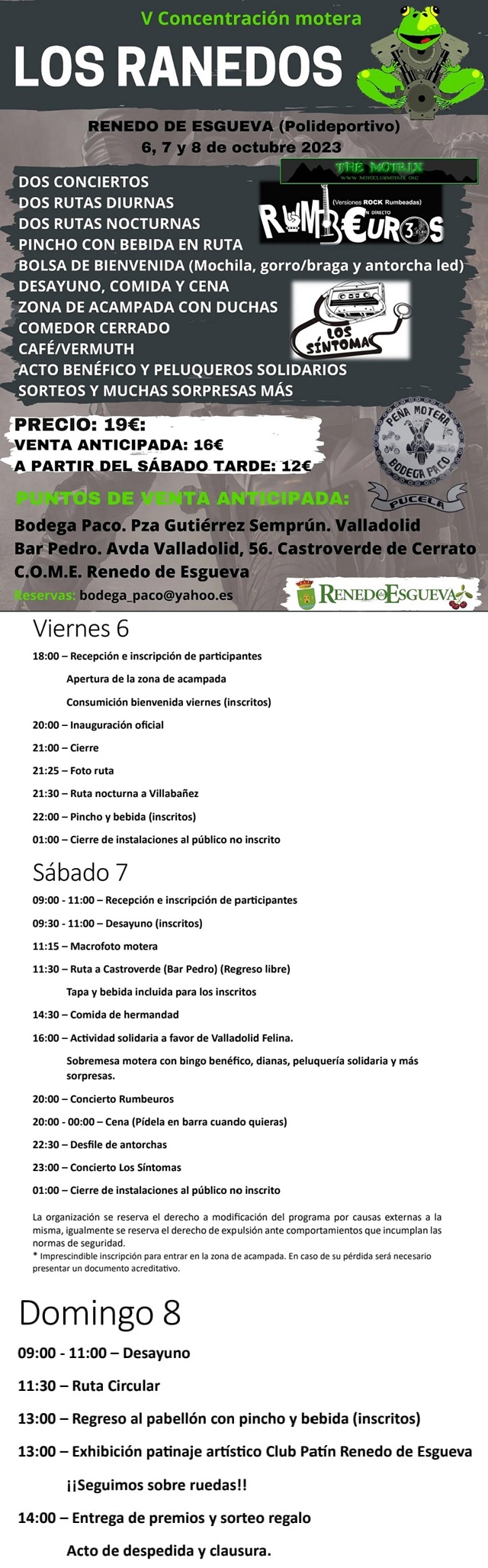 2 rutas diurnas, una ruta nocturna y un desfile de antorchas led, Acto solidario en favor de la asociación AFICRO-VALL (Fibromialgia y Fatiga Crónica) con Barbería y bingo solidarios, realidad virtual, concierto, juegos, sorpresas, sorteos, muchos regalos risas y MOTOS!! Ah y un mercadillo virtual a traves de Wallapop que llamamos MercaMotero Ranedos