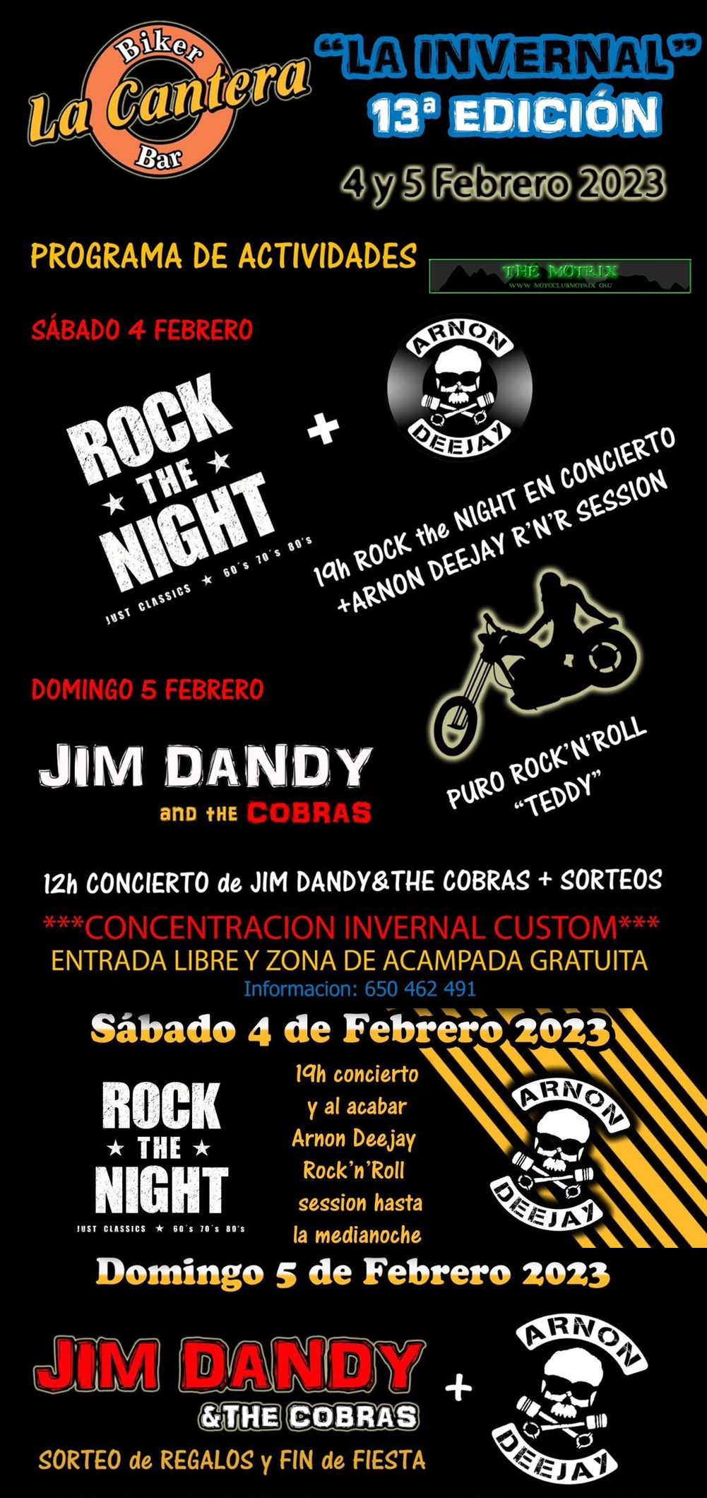 13a Concentración Invernal; el Sabado a las 11h ruta en moto (sólo para valientes) y por la tarde "Rock The Night" en directo+Arnon Deejay dándolo todo hasta la medianoche.