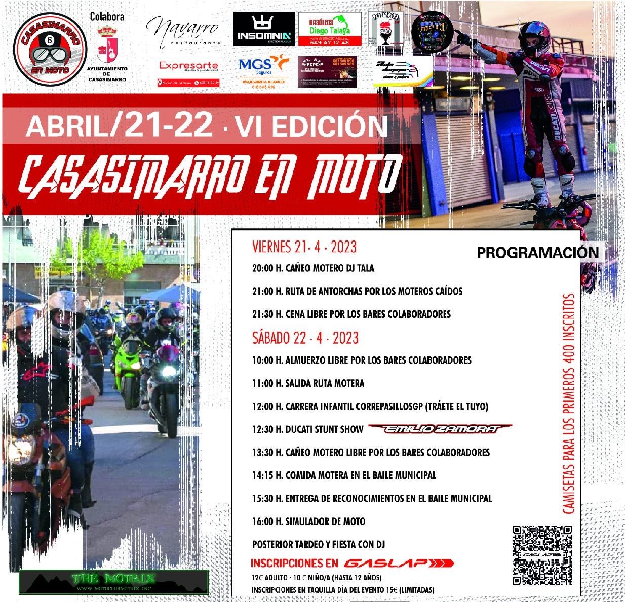 La inscripción este año incluye camiseta oficial 8ª edición Casasimarro en Moto (sólo para los 250 primeros inscritos), comida, bebida y postre, del sábado, sorteos y una experiencia en el simulador XBike.