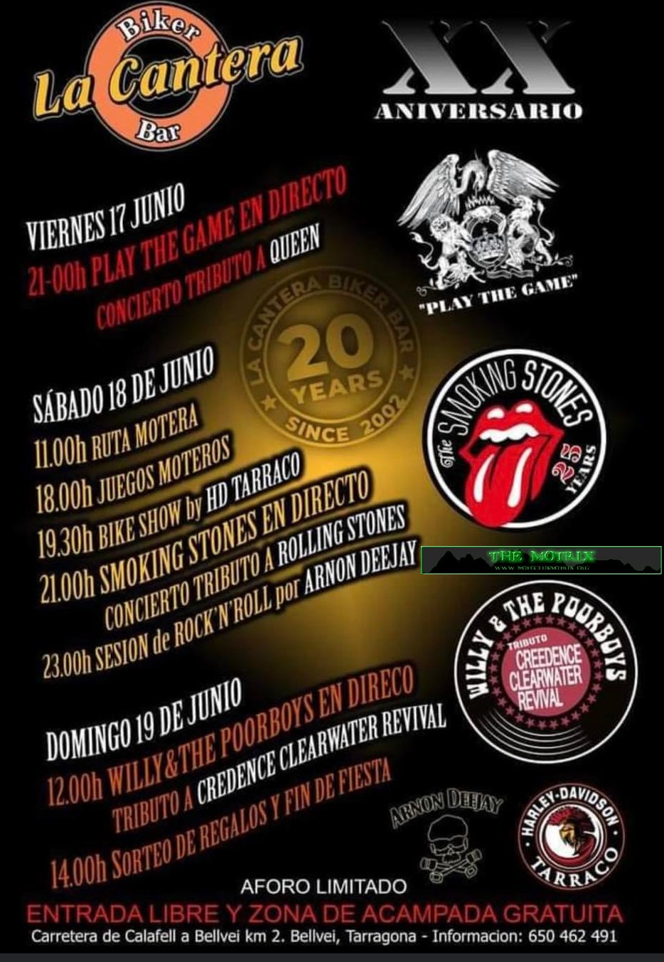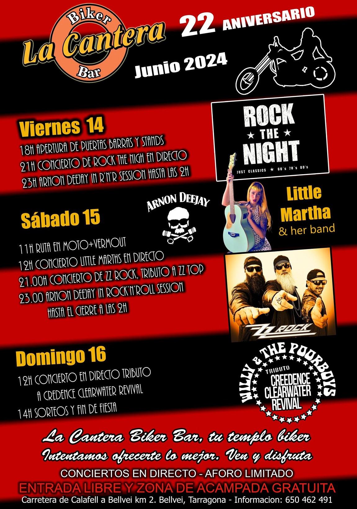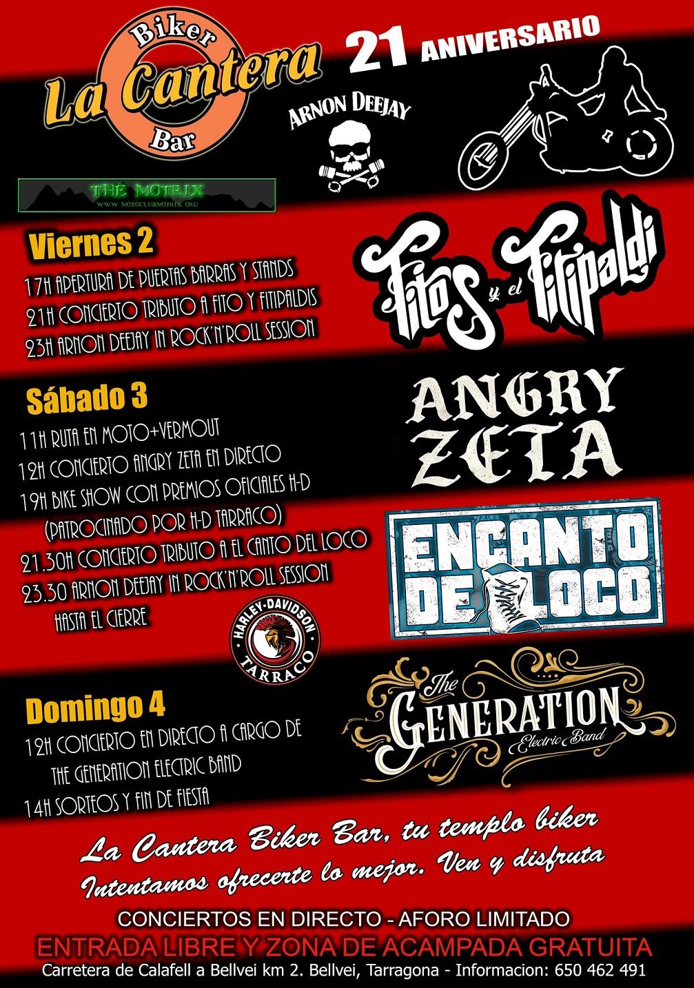 Los días 2, 3 y 4 de Junio celebraremos nuestro 21º Aniversario. Para hacerlo a lo grande os vamos a ofrecer 4 conciertos con entrada gratuita y un fin de semana de motos y Rock'n'Roll. El Sábado tarde tendremos nuestro popular Bike Show patrocinado por HD Tarraco.