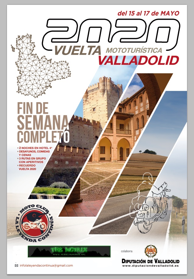 El Moto Club La Leyenda Continúa de Valladolid, organizador, entre otras actividades, de la Concentración Invernal de enero “La Leyenda Continúa” en Cantalejo (Segovia), vuelve a organizar para los días 18,19 y 20 de mayo la “VUELTA MOTOTURÍSTICA A VALLADOLID”, un completo fin de semana, desde la noche del viernes en la que tendrá lugar la recepción de los motoristas participantes en un hotel de la zona, hasta la comida de despedida del domingo, durante el que se recorrerán carreteras y rincones poco conocidos de la provincia, en plena meseta castellana, visitando lugares de interés y degustando los más típicos productos gastronómicos de la zona, en la inscripción se incluyen todos los gastos de dos noches de hotel, desayunos, comidas, cenas y aperitivos en ruta, programa y recuerdo de la Ruta.