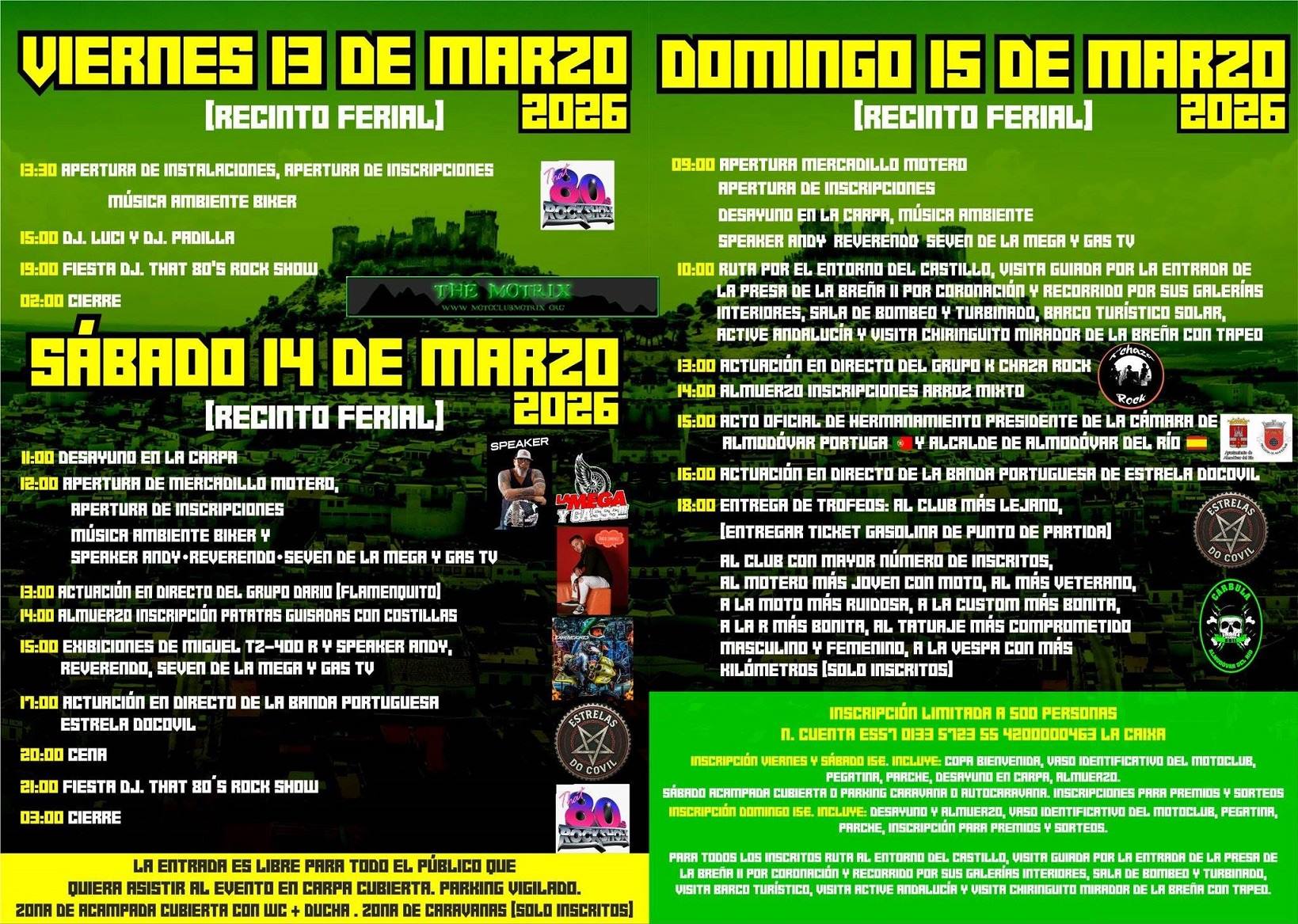 Buenas amig@s del Moto Club Cárbula Almodóvar del rio, este año contaremos con DJ NAVARRO, DUO DJ FHAT 80 ROCKSHOW, SPEAkER ANTONI M, CONCIERTO DE LIHTŚ SONS VERSIONES DE ROCK DE LOS 80 Y 90 ,EXIBICIONES DE MIGUEL TZ 400 R, CARPA DE 1000 M/2 EN LA ZONA NUEVA DEL RECINTO FERIAL, ACAMPADA CUBIERTA, WC, DUCHA, ALOJAMIENTOS, MERCADILLO MOTERO, CASTILLO INFLABLE, PUESTO EROTICO PUESTOS DE MERCHANDISING Y MUCHAS MAS NOVEDADES QUE NO TE LO CUENTEN, YA TIENES CITA EL 14,15,16 DE MARZO 2025 EN ALMODÓVAR DEL RIO