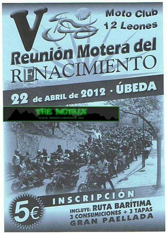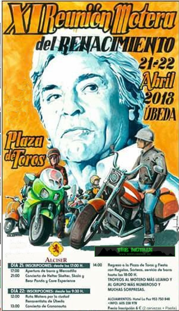 Mamen escribió:La presentación consistirá en la 'primera ruta del renacimiento ciudad de Úbeda' y la primera ruta barítima por diversos establecimientos de la localidad para degustar unas caitas, gentiliza de los establecimientos, después nos reuniremos todos en la calle picasso donde el seor alcalde leerá un manifiesto y habrá fiesta motera con mas cerveza y aperitivos por cuenta del motoclub organizador hasta que se acabe, sorteo de varios regalos entre los cuales hay una noche para cuatro personas en una cabaña de madera, las personas que deseen venir el día de antes, se le habilitara zona de acampada gratuita y habrá fiesta motera a precios populares en una de las ciudades mas bonitas del renacimiento, quedáis todos invitados.