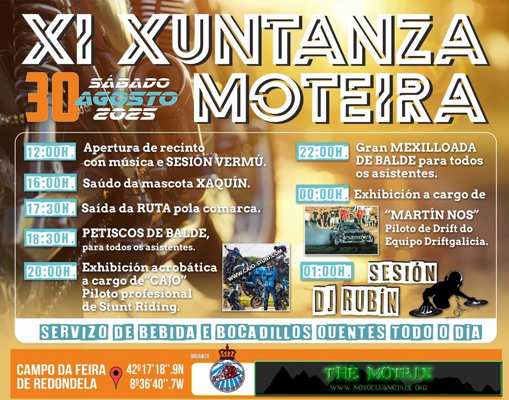 Los actos darán inicio a las 12.00 da mañana con la apertura del recinto situado no Campo da Feria, con animación musical y sesión vermú. A las 16.00 horas tendrá lugar el saludo de la mascota Xaquín y a las 17:30 dará inicio o ruta motero por la comarca. A las 18:30 habrá pinchos gratis y a las 21:00 da tarde el primer pase de exhibición acrobática a cargo del piloto de freestyle Cajo.