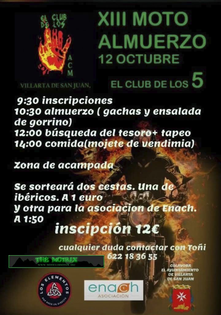 Se sorteará una inscripción para Motauros 2023, hay muchas cosas más, que no podemos decir ,este año es nuestro x aniversario, hay que celebrarlo. Hacemos una recogida de comida no perecederos para el banco de alimentos, los moteros somos gente solidaria, vamos a echar una mano!!! Hay zona de acampada, recordaremos a nuestros caídos, amigos y familiares con un responso. Buena música con los 5 Elementos