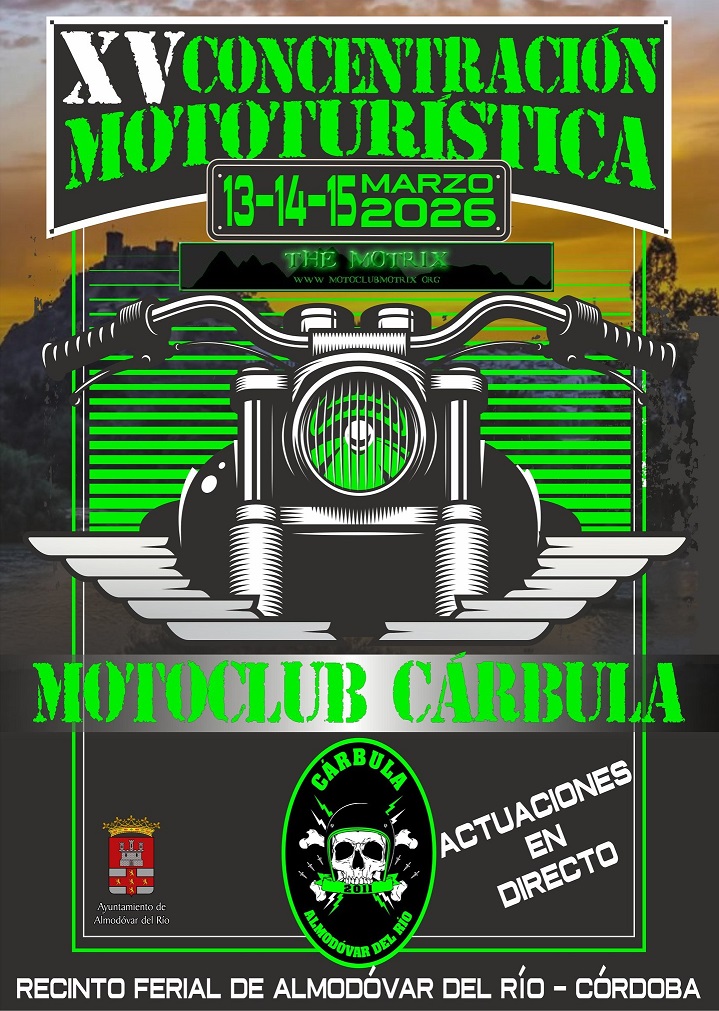 Buenas amig@s del Moto Club Cárbula Almodóvar del rio, este año contaremos con DJ NAVARRO, DUO DJ FHAT 80 ROCKSHOW, SPEAkER ANTONI M, CONCIERTO DE LIHTŚ SONS VERSIONES DE ROCK DE LOS 80 Y 90 ,EXIBICIONES DE MIGUEL TZ 400 R, CARPA DE 1000 M/2 EN LA ZONA NUEVA DEL RECINTO FERIAL, ACAMPADA CUBIERTA, WC, DUCHA, ALOJAMIENTOS, MERCADILLO MOTERO, CASTILLO INFLABLE, PUESTO EROTICO PUESTOS DE MERCHANDISING Y MUCHAS MAS NOVEDADES QUE NO TE LO CUENTEN, YA TIENES CITA EL 14,15,16 DE MARZO 2025 EN ALMODÓVAR DEL RIO