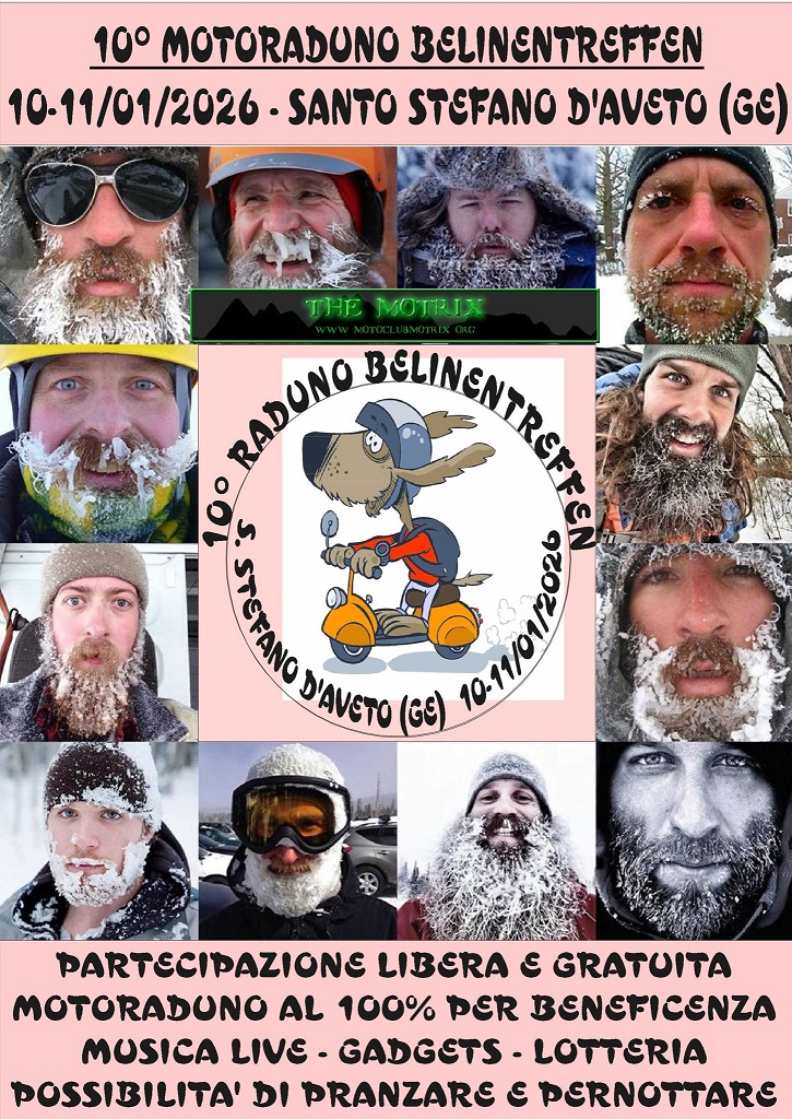 Somos un grupo de amigos que organizamos una reunión invernal en la ciudad de Barbagelata, el pueblo más alto dell’Appennino Ligure en la provincia de Génova; El nombre de esta reunión de motos,es Belinentreffen , un pequeño homenaje a otra mucho más grande
