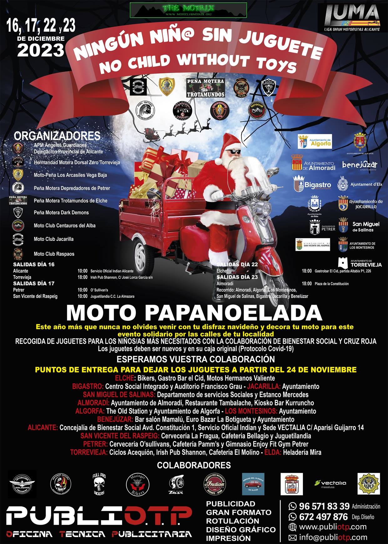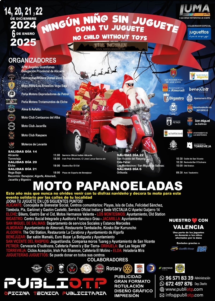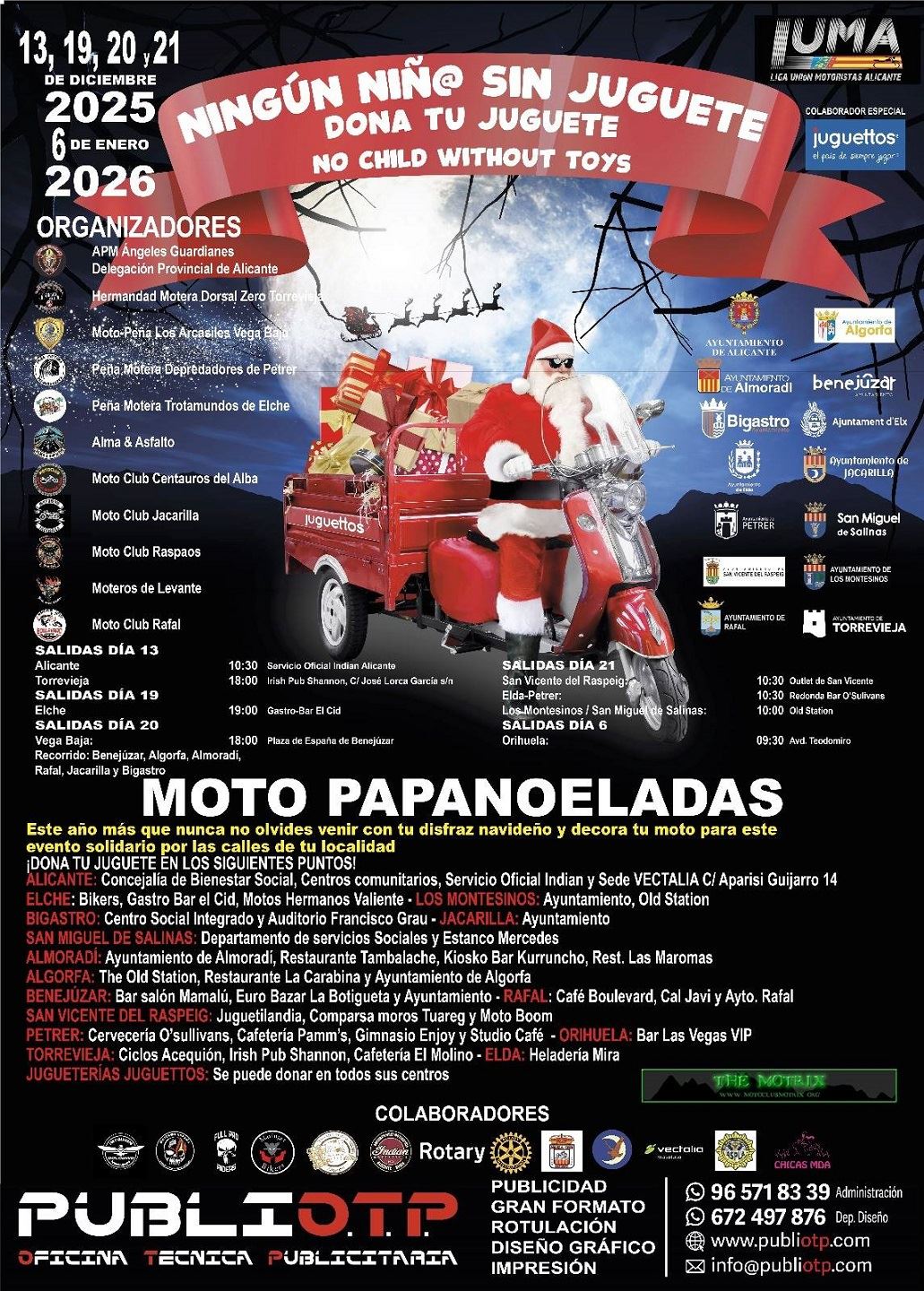 Nos gustaría compartir con vosotros el cartel de las Motopapanoeladas que organizamos desde la LIGA UNION MOTORISTA ALICANTINA (L.U.MA.) en distintos municipios de la provincia de Alicante, dentro de la campaña NINGÚN NIÑO SIN JUGUETE. El evento consiste en una ruta solidaria en la que motoristas, vestidos de Papá Noel, recorremos varias localidades recogiendo juguetes para niños y niñas que los necesitan. Las actividades tendrán lugar los días 19, 20 y 21 de diciembre, así como el 6 de enero.