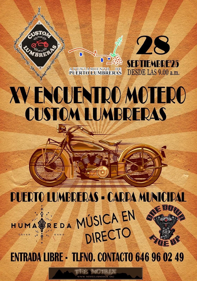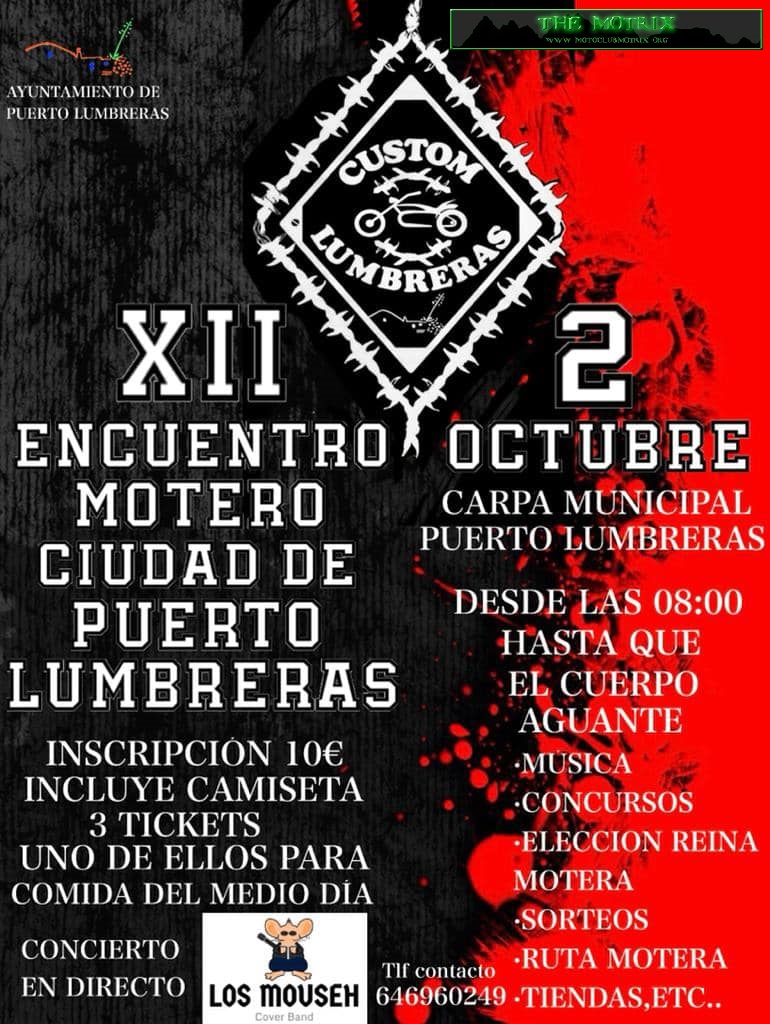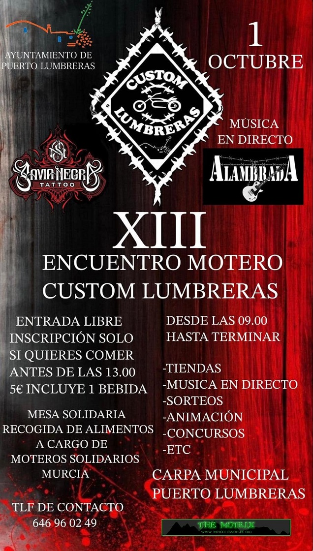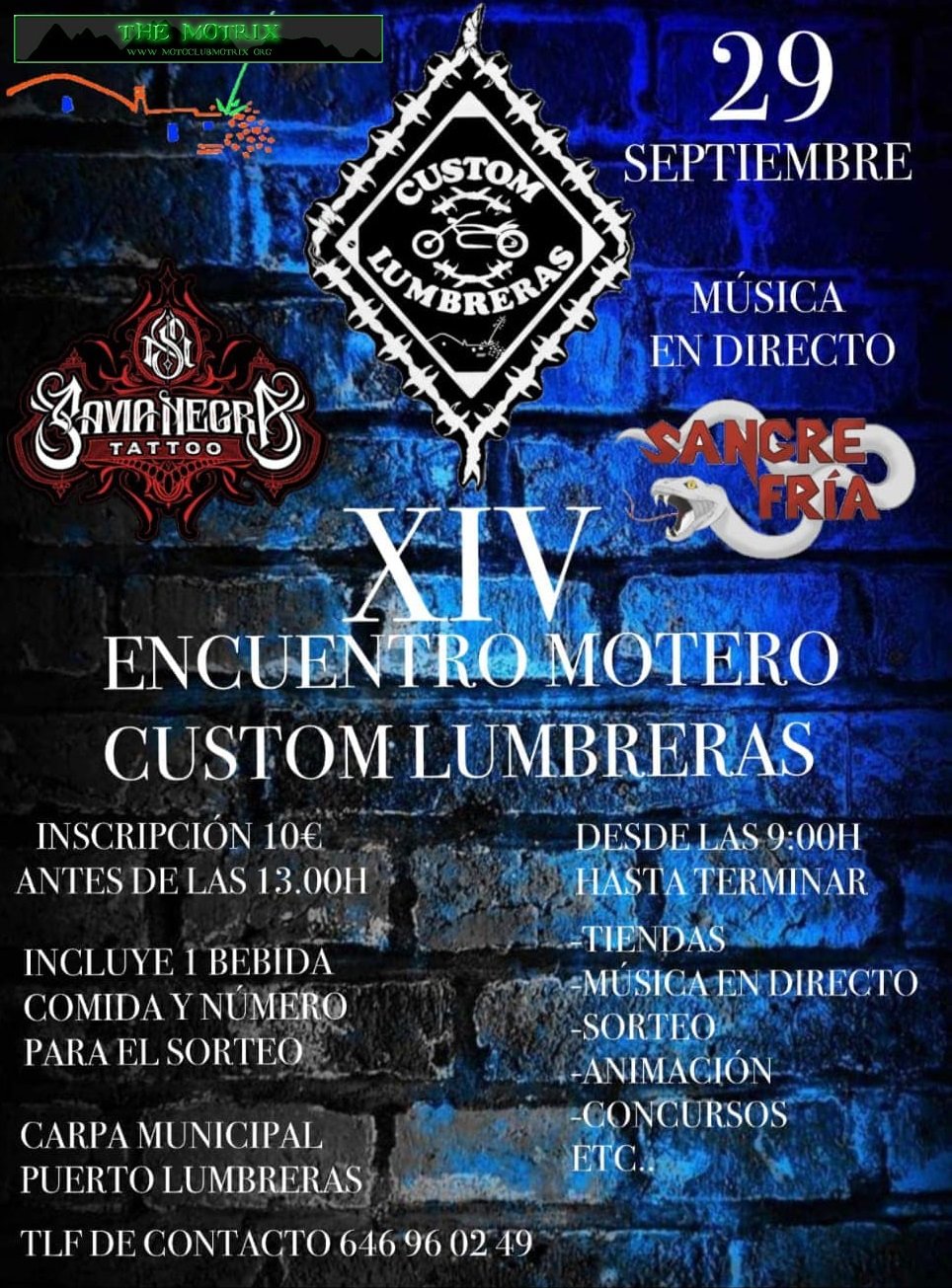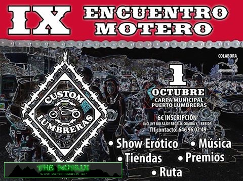 En la Carpa Municipal de Puerto Lumbreras,organiza Custom Lumbreras, inscripción 6 euros incluye camiseta una bebida en la barra y comida al medio día, tiendas, música, sorteos, show erótico, ruta etc..