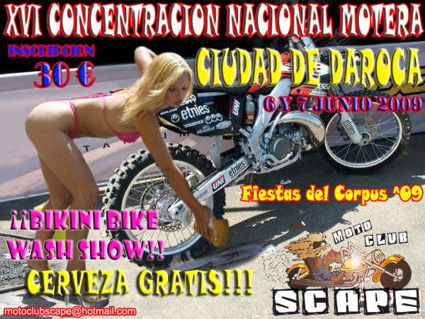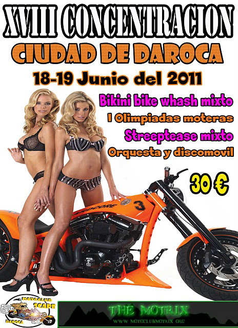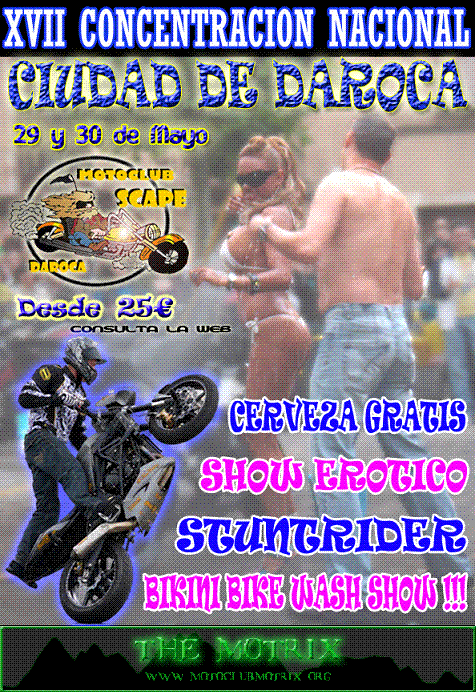 19:00 h Ruta barista por Daroca , en el centro de la ciudad donde podremos utilizar los ticket de consumiciones que regalamos , ir de peñas , ver a las reinas de este año y disfrutar de la actucion del STUNTRIDER y del " BIKINI BIKE WASH SHOW " donde unas bellezas limpiaran las motos de unos afortunados y al dueño si se deja tambien.