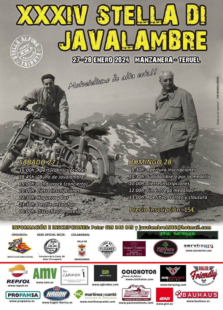 Actividades: Reunión réplica de la mítica concentración moto turística Stella Alpina que se celebra en los Alpes italianos. Como en aquella, si quieres la medalla del evento, tienes que subir a buscarla por una pista forestal, en nuestro caso la del Pico Javalambre. Accesible a todo tipo de motos. Con la medalla conseguida, espera un aperitivo y un gran sorteo de regalos. Además, el sábado noche, se realiza el desfile de las antorchas (fuego real) en honor a los caídos. Algo más tarde, se podrá disfrutar de una "motofiesta" en discoteca...hasta que el cuerpo aguante. La acampada en el Parque Municipal de Manzanera (este año el camping está cerrado) está incluida en la inscripción.