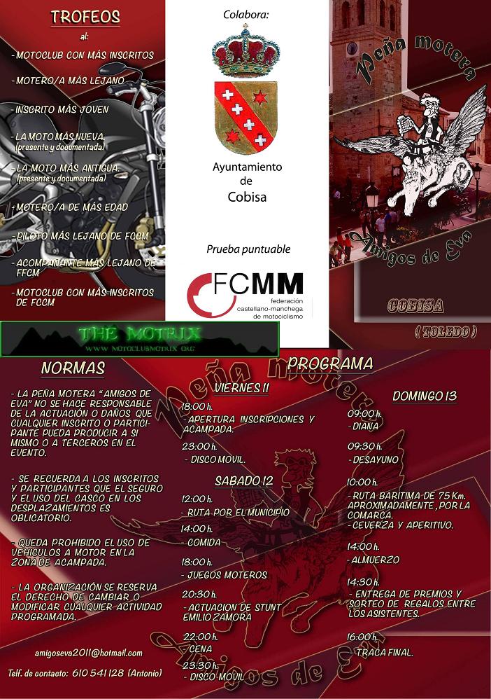 Apertura de inscripciones el viernes a las 18:00 horas, discoteca movil el viernes y sàbado, habrà juegos moteros y de agua, asì nos refrescamos, exhibiciòn del stunt EMILIO ZAMORA, rutas barìtimas el sàbado por la mañana y el domingo. Y como siempre cerveza de bienvenida, piscina, ducha en el recinto, acampada y duchas, comida y cena el sàbado, desayuno y comida el domingo, trofeos y sorteos. Puntuable para mototurismo manchego.