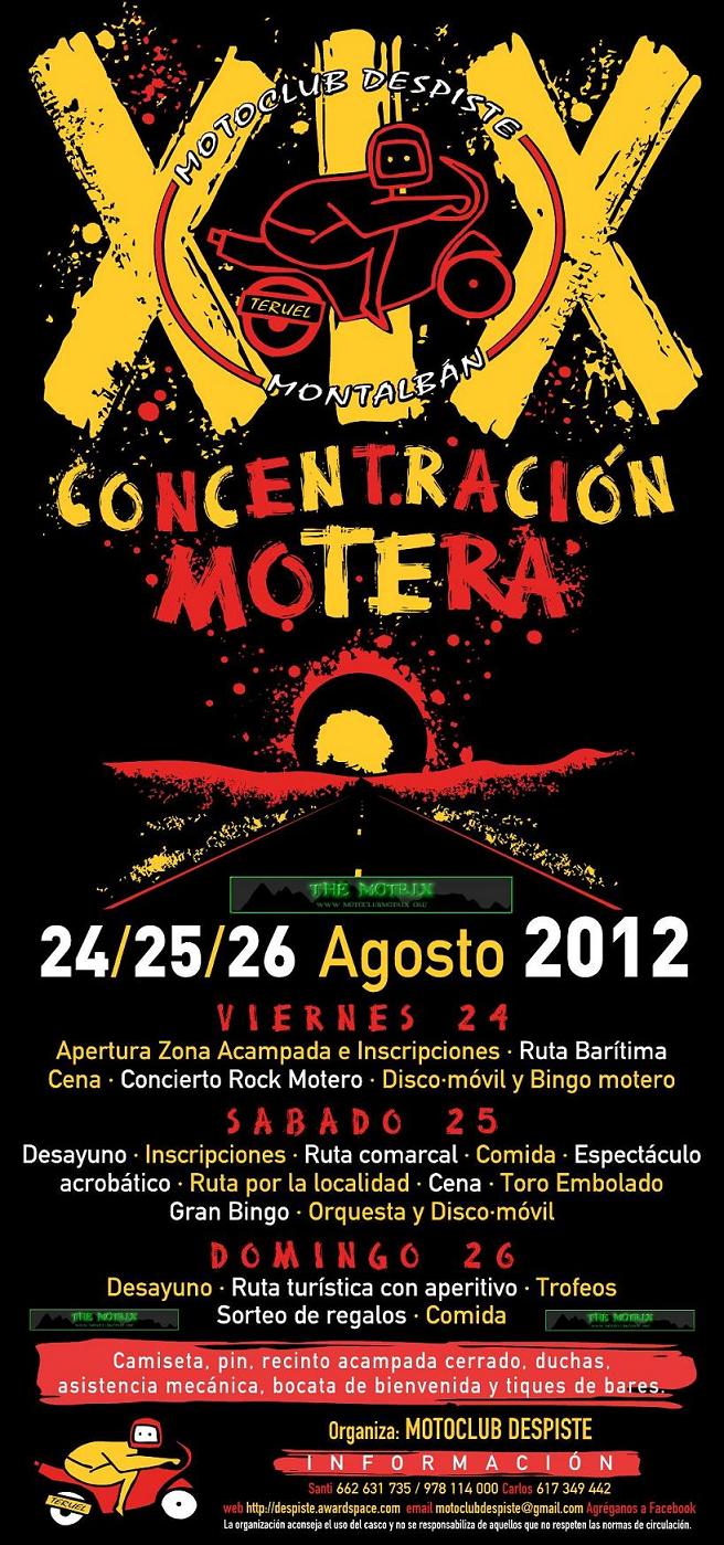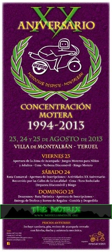 OTRO AÑO MAS!! YA 19, DE LAS MAS ESPERADAS, YA ESTA AQUI, LA CONCENTRACION DE MONTALBAN, DE GRAN CALIDAD MOTERA FIESTERA Y GASTRONOMICA. EL VIERNES SE ABREN LAS INCRIPCIONES CON BOLSA CON CAMISETA, TICKETS BARES Y REGALOS, ENTRADA PISCINA, Y BOCATA Y BIRRA DE BIENVENIDA. DESPUES UNA CENA AL MAS PURO ESTILO ARAGONES, Y UN CONCIERTAZO DE ROCK NOS DELEITARA EN LA SOBREMESA, PARA IRNOS DIRECTAMENTE AL AMBIENTE LOCAL EN LA PLAZA DEL PUEBLO, A LOS PIES DE LA IMPONENTE IGLESIA BAILAREMOS HASTA NO PODER MAS Y DISFRUTAREMOS DE UN BINGO MOTERO. POR LA MAÑANA DESAYUNO, RUTA PARA CONOCER LAS EXCELENCIAS DE LA COMARCA Y A LA VUELTA RELAX Y A COMER, 3 PLATOS Y POSTRE CAFE Y CHUPITO. POR LA TARDE DISFRUTAREMOS DE LA EXHIBICION DE STUNT A CARGO DE EMILIO ZAMORA Y SUS DUCATI. DESPUES DAREMOS LA VUELTA AL PUEBLO TODOS EN PROCESION COMO MARCA LA TRADICION PARA QUE LA GENTE SE VUELVA LOCA CON LOS RUGIDOS DE NUESTRAS MOTOS, DESPUES RUTA BARITIMA Y A CENAR 3 PLATOS