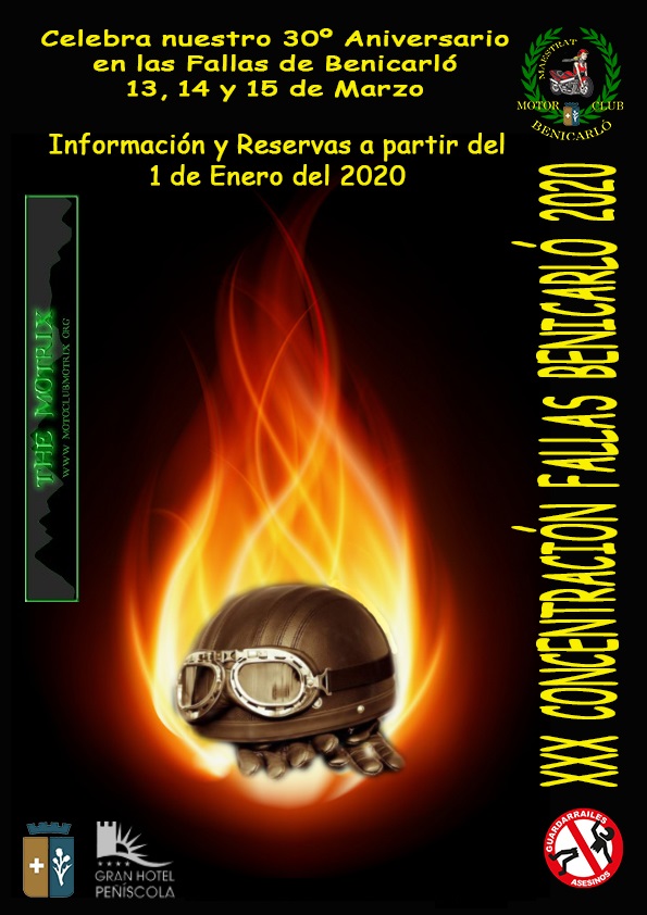 Disfruta de la 30ª edición de nuestra Concentración Motera de Fallas, un año mas mantenemos el alojamiento para los asistentes en el Hotel Gran Peñiscola pero no dispondremos de zona de acampada, tendremos una nueva zona motera de la concentración donde habran diversas actividades y alguna que otra novedad.