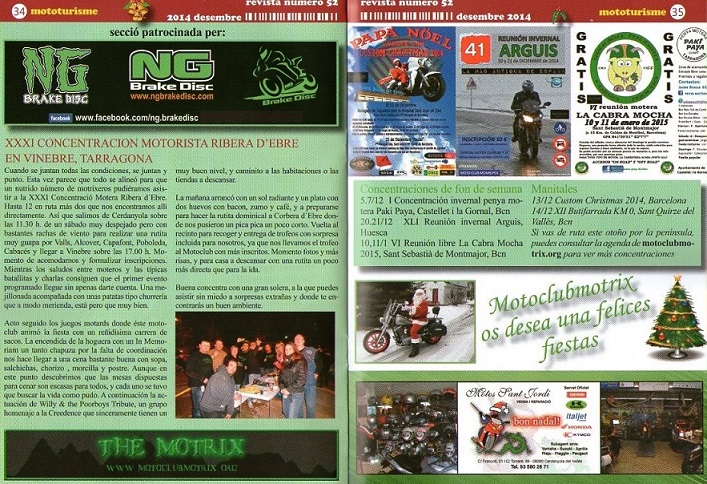 Cuando se juntan todas las condiciones, se juntan y punto. Esta vez parece que todo se alineó para que un nutrido número de motrixeros pudiéramos asistir a la XXXI Concentració Motera Ribera d´Ebre. Hasta 12 en ruta más dos que nos encontramos allí directamente. Así que quedamos en Jorba a las 12.30 h. de un sábado muy despejado pero con bastantes rachas de viento para realizar una rutita muy guapa por Valls, Alcover, Capafont, Poboleda, Cabaces y llegar a Vinebre sobre las 17.00 h. Momento de acomodarnos y formalizar inscripciones. Mientras los saludos entre moteros y las típicas batallitas y charlas consiguen que el primer evento programado llegue sin apenas darte cuenta. Una mejillonada acompañada con unas patatas tipo churrería que a modo merienda está pero que muy bien.
