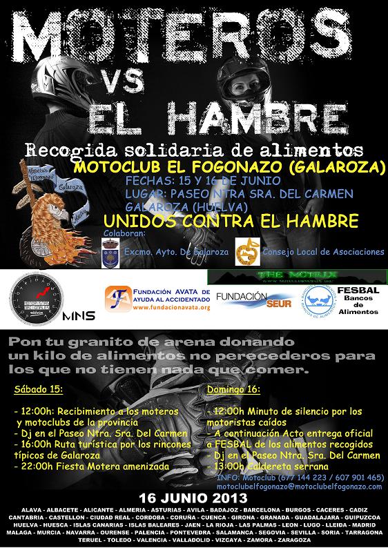 Desde el Motoclub “El Fogonazo” queremos hacerte participe de un evento sin precedentes en España. Se trata de una recogida solidaria de alimentos no perecederos en beneficio de la Federación Española del Banco de Alimentos (FESBAL) a nivel nacional los días 15 y 16 de Junio.