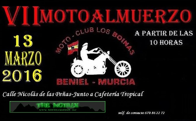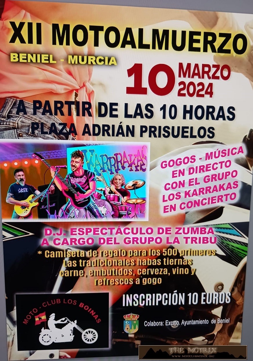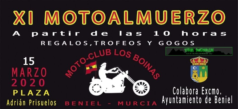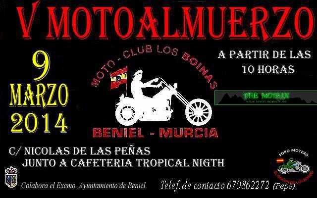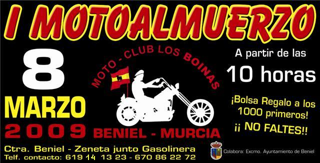 I Motoalmuerzo en Beniel, Organizado por el Moto-Club "Los Boinas", a partir de las 10 de la mañana, tendremos bolsa de regalo, comida y bebida por un tubo, sorteos, musica de la buena, 2 pedazos de go-gos para alegrarnos la vista y a algunos el cuerpo y una buena ruta baritima por el pueblo.
