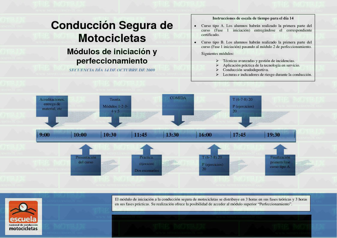 Como ya es sabido, los cursos de "perfeccionamiento" desarrollados por la Escuela Nacional de Conducción de Motocicletas basan su estrategia formativa en la intensificación de las actividades prácticas guiadas, generando en los alumnos las capacidades necesarias de anticipación y técnica de respuesta adaptadas al espacio por el que circulamos.