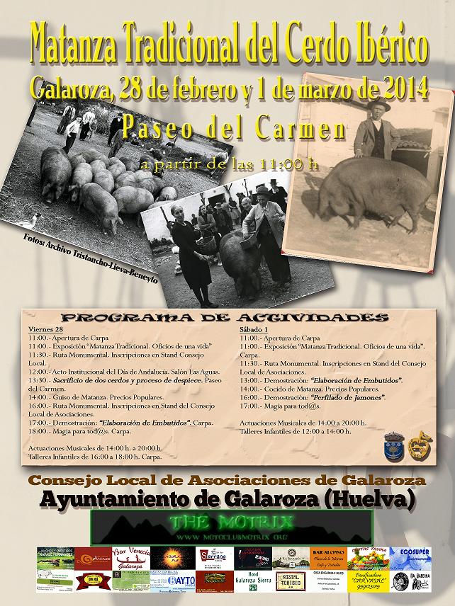 Este año la ya tradicional “Fiesta de La Matanza” en Galaroza serán los días 26 y 27 de Febrero, se montará una gran carpa en el paseo Ntra. Sra. del Carmen, donde se despiezarán, una vez sacrificados, dos cerdos a la manera tradicional y habrá, carne ibérica, guisos, bebidas, mucha música y mucho rugir de motos hasta el amanecer, os esperamos.