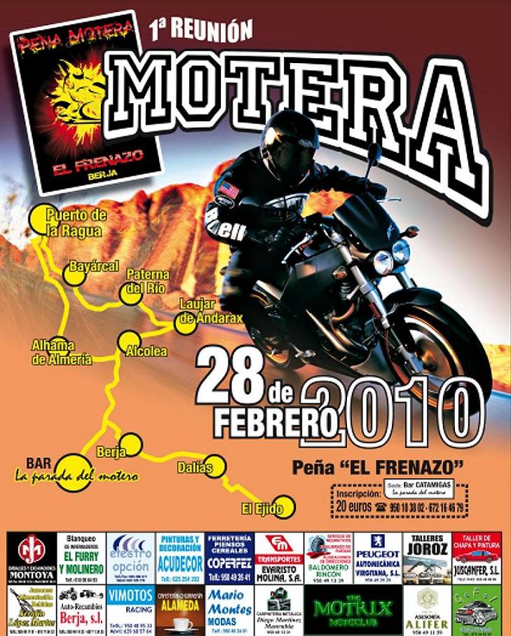 Salida de jovimoto , Ejido ,hacia Berja ,restaurante Catamigas la parada del motero ,inscripción ,desayuno salida para el puerto la Ragua bocadillo con cerveza refresco o vinito, regreso a Berja restaurante Catamigas ,comida ,migas y chuletada con bebida ,café y copa a elegir concurso de lanzamiento de barril con premio al ganador y 10 sorteos por numero de inscripción