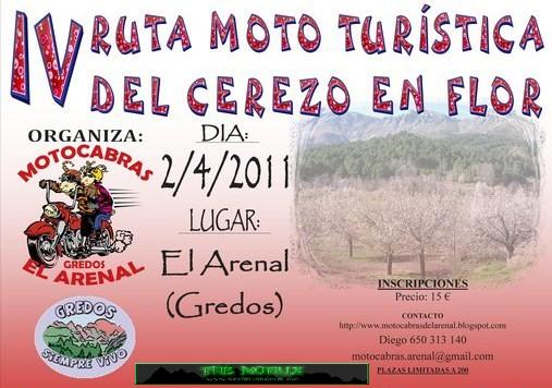 Desde el Motoclub Motocabras de El Arenal (Gredos), os queremos informar que el sábado 27 de marzo celebraremos la III Ruta del Cerezo en Flor en El Arenal. Saldremos alrededor de las 11 de la mañana con dirección al Puerto de La Centenera, Puerto de El Pico, Cuevas del Valle, Mombeltrán, La Parra, Arenas de San Pedro, El Hornillo y El Arenal. Ruta corta pero intensa, con curvas, paisaje entre cerezos florecidos y, desgraciadamente, entre terreno calcinado por el último incendio. Llegaremos a El Arenal sobre las 13 horas, y tendréis un ratito de descanso antes de la comida, para que el que quiera haga fotos por el pueblo, su paisaje y sus gentes, se acerque hasta la zona reforestada en octubre para ver si su árbol sigue verde y disfrute del tapeo de tostas de setas, boletus, revolconas, etc.
