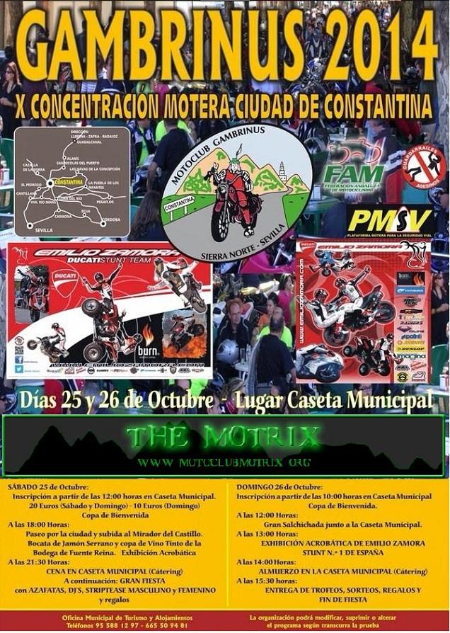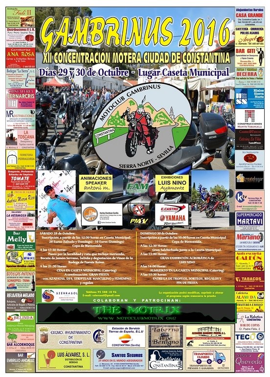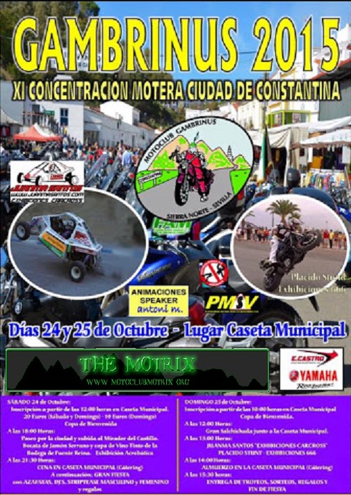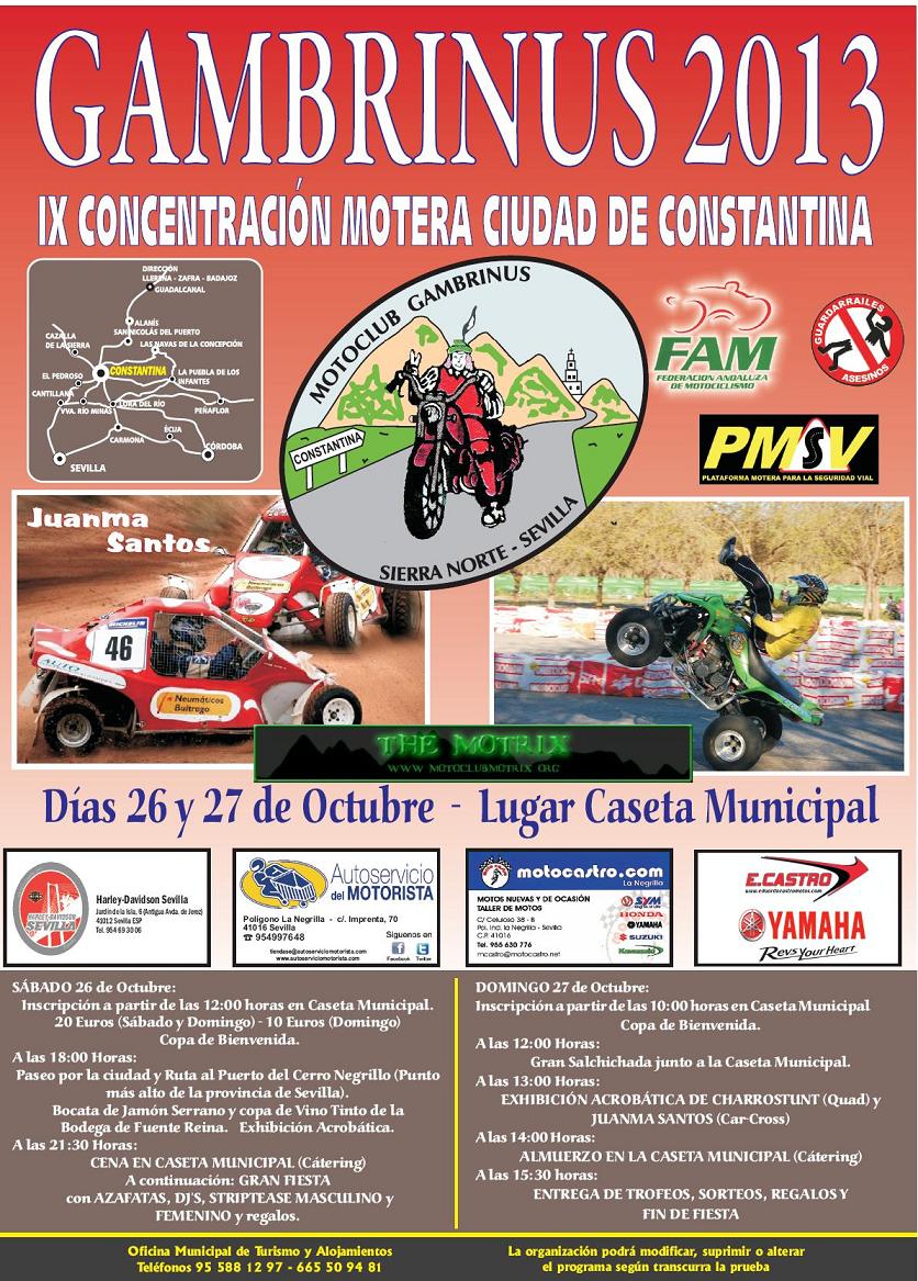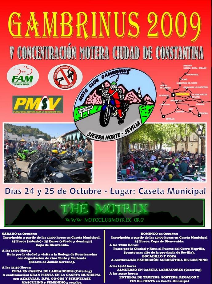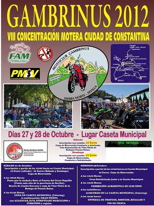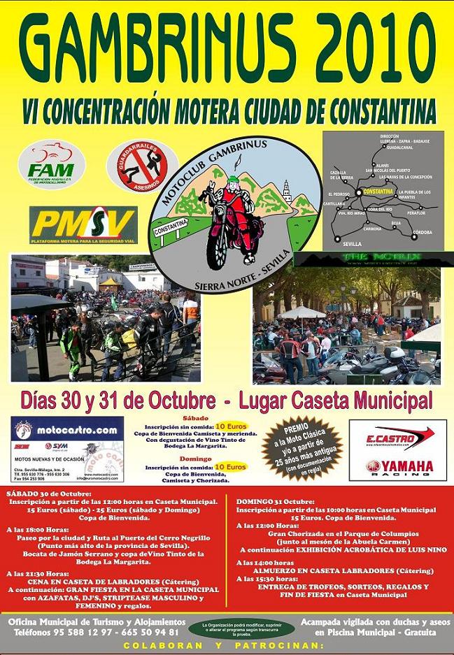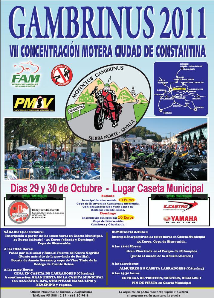 VII CONCENTRACIÓN MOTERA CIUDAD DE CONSTANTINA Días 29 y 30 de Octubre lugar: CASETA MUNICIPALMotrix Reloaded escribió:VII CONCENTRACION GAMBRINUS 2011 CIUDAD DE CONSTANTINA