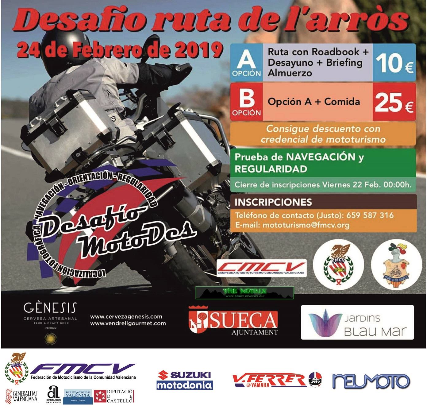 El Moto Club Sueca en su 60 Aniversario se complace organizar el 1er Desafío "Ruta de l´Arrós 2019" que tendrá lugar el domingo día 24 de Febrero de 2019, puntuable para el Campeonato de Mototurismo de la Comunidad Valenciana.