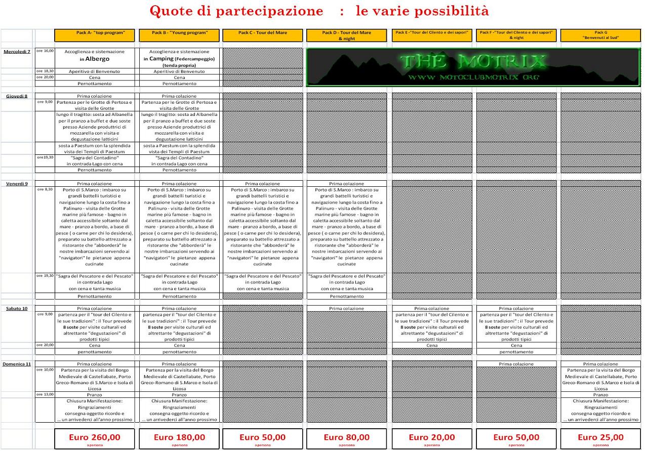 Se planificó para satisfacer las diversas necesitadas y llevar a los motoristas a esta fórmula innovadora ideada por la Comisión Nacional de Turismo del FMI, varios “paquetes” que ofrecen para la participaciones cualquier programa con la opción de alojamiento de alto nivel o Camping (cada uno su tienda), con tasas muy bajas y personalizado de acuerdo a su disponibilidad de tiempo.